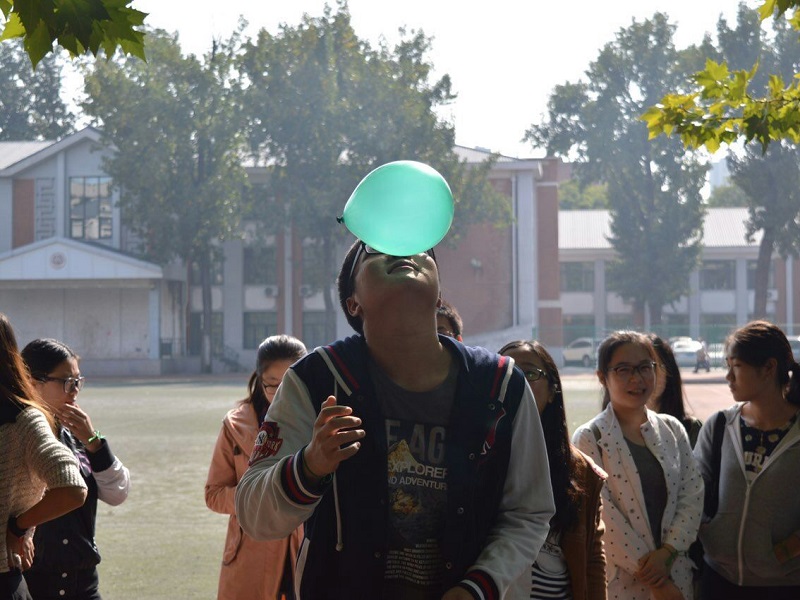 首先进行的是顶气球接力项目,每组选出5人参赛,每人顶一次气球,先顶到指定位置的小组胜利。各组成员通过深入交流,选出更适合此项目的成员参赛。接下来进行的是吃零食接力,每组派出5位成员,分别按规定顺序吃下威化巧克力,果冻,香蕉,火腿肠,可乐,矿泉水,吃喝干静后下一位才可继续。参加的成员们顾不及形象,努力咀嚼、吞咽。加油声此起彼伏,将气氛推向高潮。最后进行的是快乐传真项目,每组5位成员排成一列,主持人给每组第一位同学词语,通过动作接力的方式传递,最后一位同学先猜对正确词语的小组获胜。各组同学都认真商议,合理安排战术,以求取得胜利。经过激烈的比拼,最终,以宣传部部长马硕为首的红队赢得了此次比赛。赛后参加此次素质拓展的团学干事、干部们在院旗下合影留念。