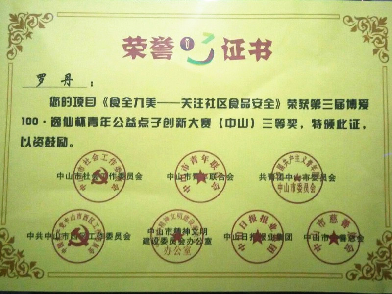 博爱100·逸仙杯青年公益创新大赛(中山)终审评审会在中山青年社会创新园落下帷幕。在大赛报名的有效期内,组委会共收到来自北京、上海、四川等15个省份及直辖市的项目作品,其中5个特等奖,10个一等奖,20个二等奖,30个三等奖。公司员工社团创益社的“食全久美”项目荣获三等奖。