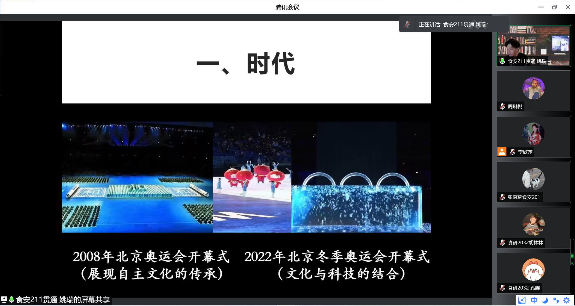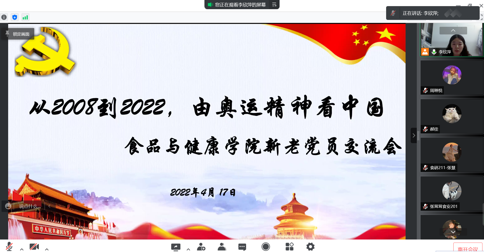 4月16日,食品健康学院2022年春季党员发展对象培训班在线上召开以“从2008到2022,由奥运精神看中国”为主题的新老党员交流会。参会人员有学院员工党务工作委员会主任周琳悦同志及17名发展对象,会议由班主任助理李欣萍主持。