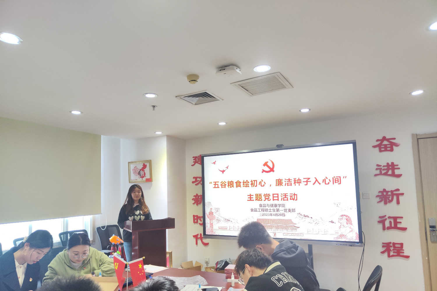 党的二十大报告提出要“加强新时代廉洁文化建设”这一重大课题,在二十届中央纪委二次全会上习近平总书记再次强调,“要在不想腐上巩固提升,更加注重正本清源、固本培元,加强新时代廉洁文化建设”。为深入学习贯彻总书记这一重要精神指示,进一步加强廉政文化建设,食品工程硕士生第一党支部于4月28日开展“五谷粮食绘初心,廉洁种子入心间”主题党日活动。学院副经理李健老师、支部党员、积极分子参加此次党日活动,活动由支部书记李欣萍主持。
