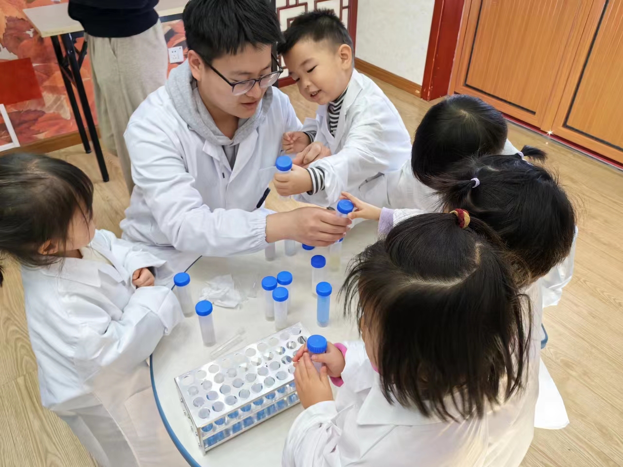 活动现场,硕士生党员温雁超、姜伟业围绕“蛋白质对健康的重要性”主题,通过视频讲解、图文结合、互动问答、动手实验等多种形式,向小朋友深入浅出的讲解什么是蛋白质、哪些食物里含有蛋白质、如何检测蛋白质等科学常识。引导幼儿从生活出发,向小朋友们生动地介绍了身边的食品安全小知识以及生活卫生常识,并根据“蛋白质特性”带领小朋友们做了趣味实验,检测不同食物中是否含有蛋白质。