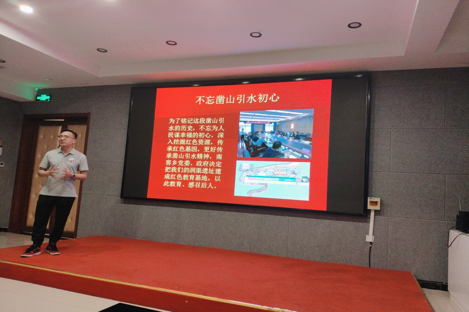 在观看南窖乡宣传片,花港洞渠宣传片后,花港村党支部书记李立权,花港村老党员董桂永大爷为我们讲述了70年代在党支部带领下20名党员凿山引水,万米洞渠建设中发生的感人故事,以及更好传承凿山引水,不忘为人民谋幸福精神的决心。不屈不挠自力更生,无私奉献的“红旗渠”精神,激励着一代又一代,感染了在座的每一位党员同志。