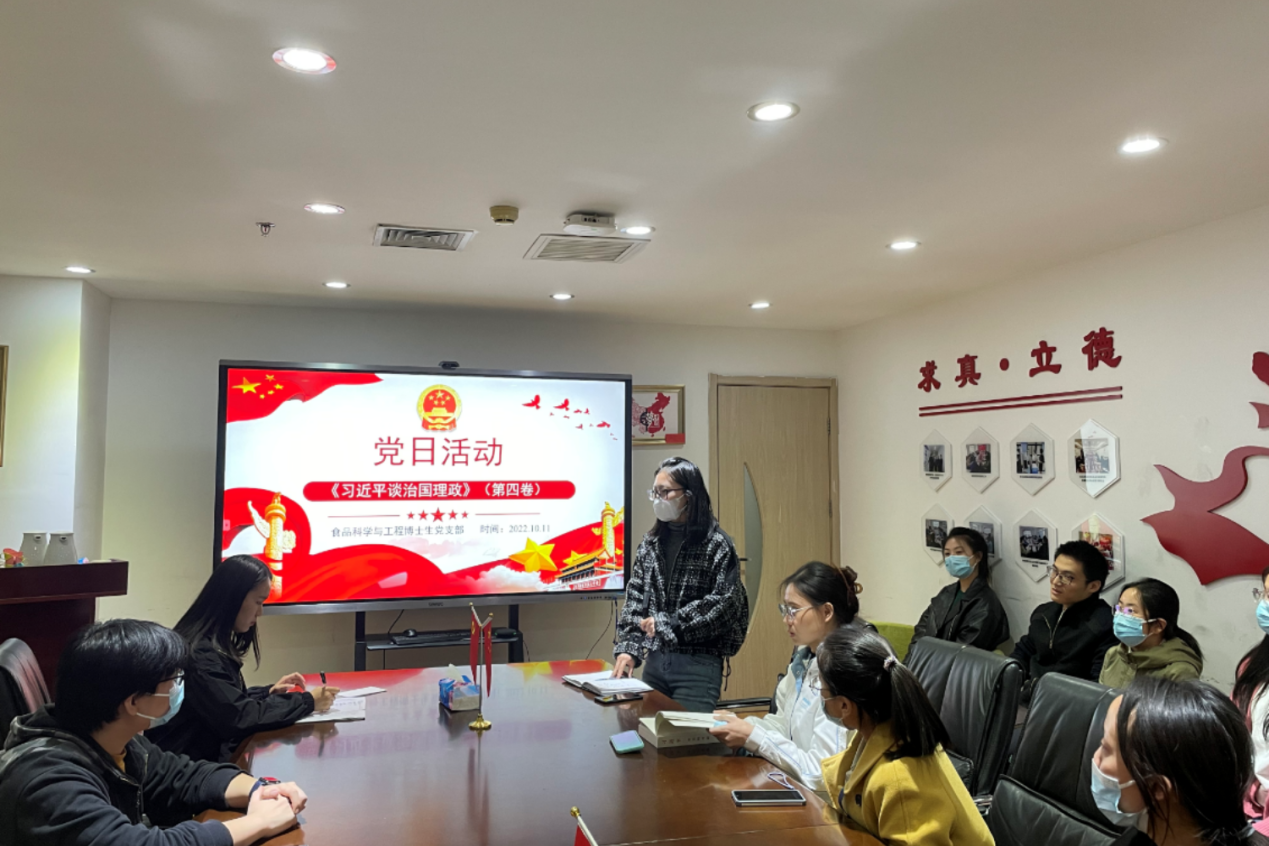 食品科学与工程硕士生第二党支部:《习近平谈治国理政》第四卷集中展现了习近平总书记在领导党和人民应变局、开新局的伟大实践中提出的一系列原创性的治国理政新理念、新思想、新战略,强化学思用贯通、知信行统一,更好地把学习成效转化为推动发展的生动实践。
