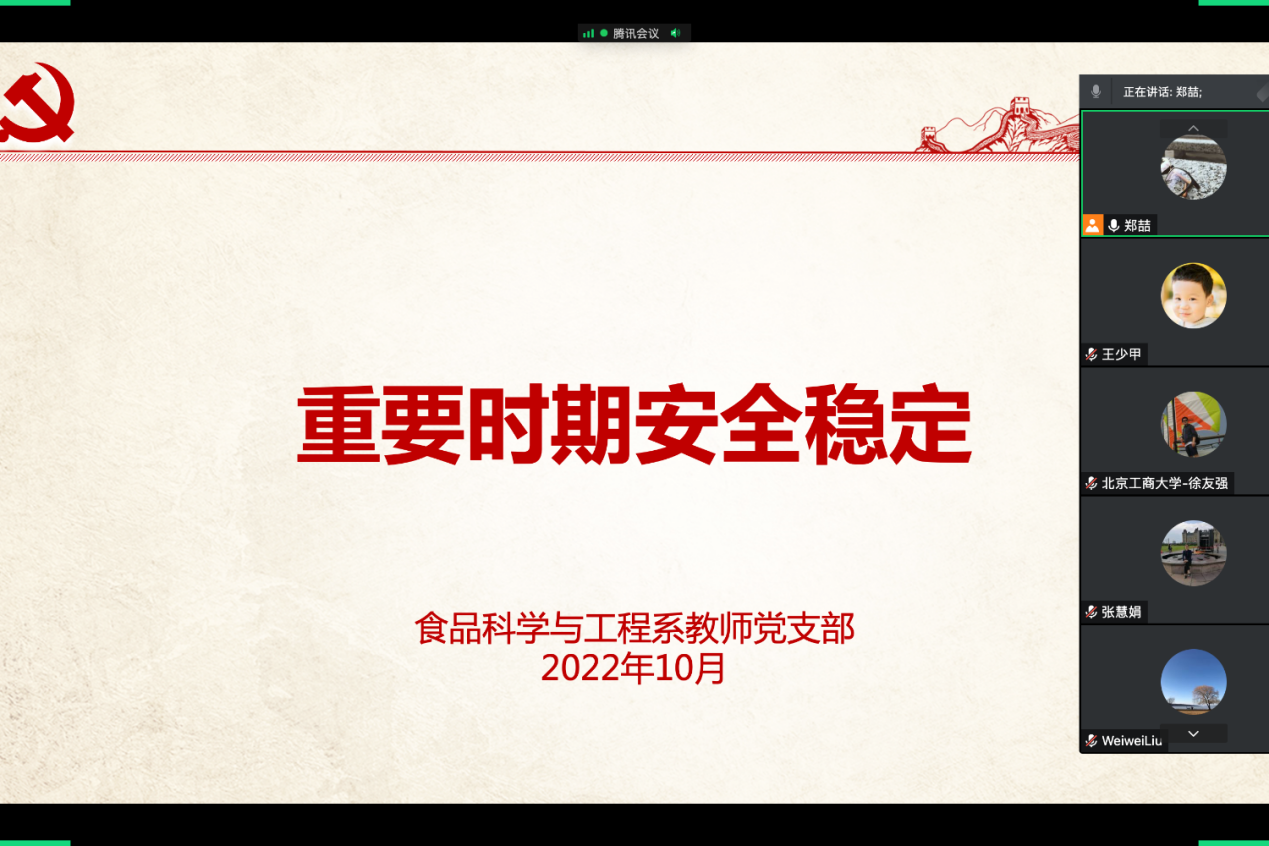 食品科学与工程系教师支部:当前国内疫情形势严峻,国外形势复杂多变,安全稳定无疑是国家发展的基石,是保障重要会议安全胜利召开的重要保障。安全稳定体现在实际行动的方方面面,如在项目合作、国际交流等过程中要严守纪律,严防反华势力的渗透破坏。在重要时期,教师党员尤其需要在遵守疫情防控政策、维护安全稳定方面发挥表率作用。同时作为本科生和研究生的导师,更需要紧密关注员工的思想动向,时时关注,处处关怀,落实“重要时期安全稳定”的工作要求。
