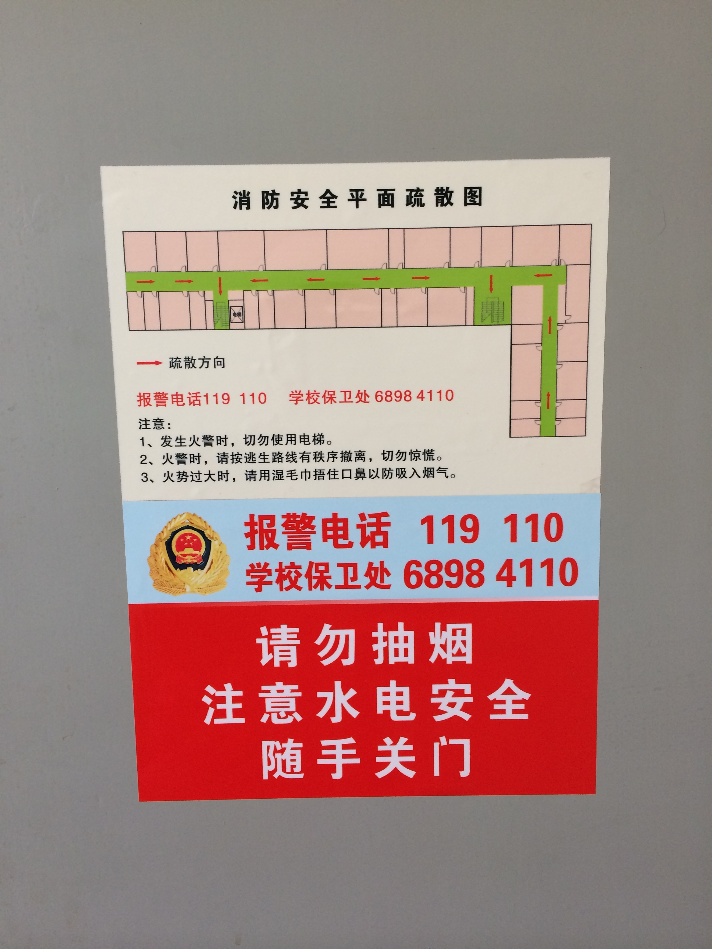 1、实验室内统一张贴安全标识,(消防安全平面疏散图+报警电话)按下图所示张贴。位置:实验室门后(朝向屋内)正中央靠上。