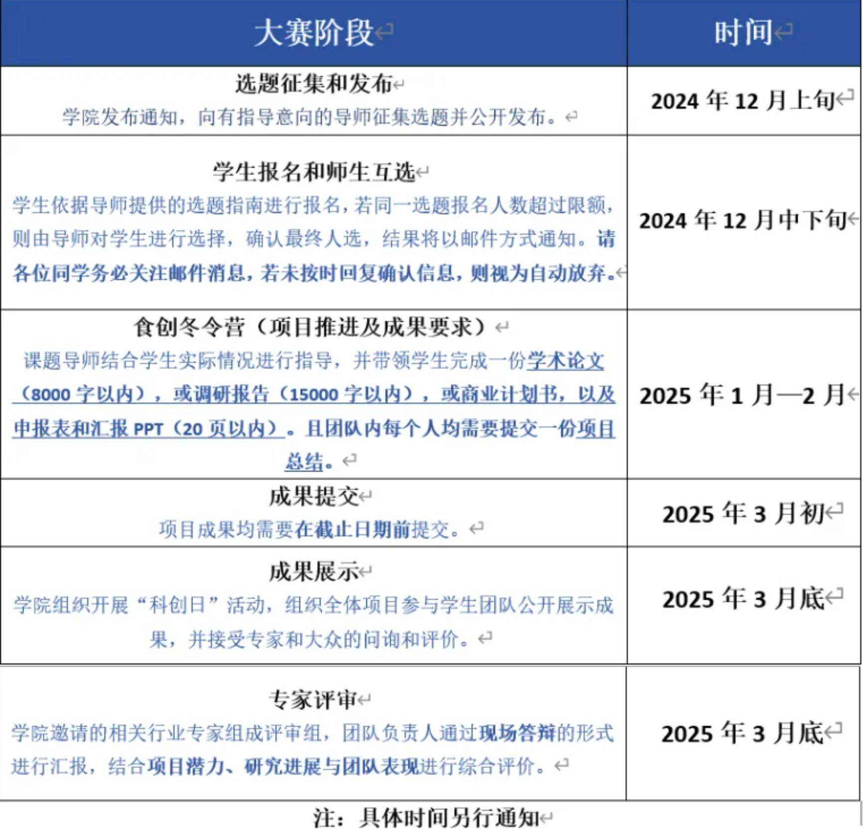 食创冬令营开营时间预计为2025年1月6日-7日,采用线下和线上相结合的方式,将开展开营仪式、集中培训、参观实验室、项目团队对接等活动,具体安排另行通知。