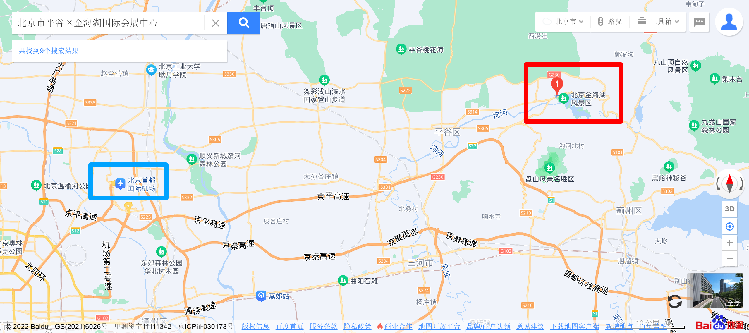 红色框为金海湖国际会展中心地址,蓝色框为北京首都国际机场
