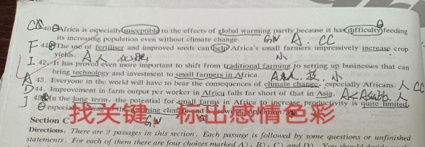 先读题目,带着题目中的点去读原文。词汇量掌握逐渐积累只是应试的要求之一,关键还是要短时间把题做对。找准文章和题目对应的关键词比花时间一点一点弄懂原文要快得多,甚至准确率也会提高。阅读在四六级分数中占比最大,所以可以把重心放在该部分。阅读题中相对难度大的应该是第一道阅读题选词填空,我的习惯是把此题放到最后做,因为生词较多且分值较小。与其他三题阅读题不同,我们应该先阅读文章,判断掌握需要填空的词应该是什么词性或者单复数等微小线索,在选择的时候即使不懂词义也能增加选对的概率。