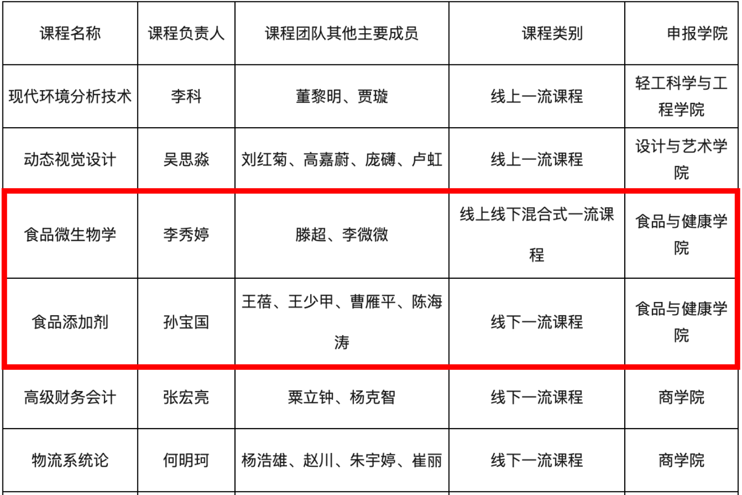 近日,教育部发布了《关于第三批国家级一流本科课程认定结果的公示》。世界杯网址《食品添加剂》、《食品微生物学》2门课程入选第三批国家级一流本科课程,涵盖了线上线下混合式一流课程、线下一流课程两个类别。