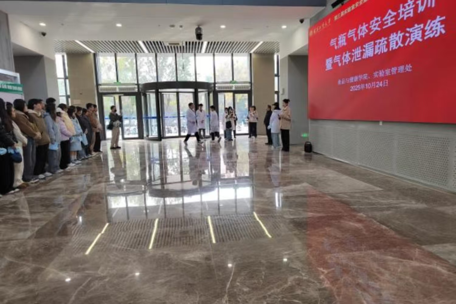 为切实加强实验室安全管理,营造“人人讲安全、个个会应急”的校园安全氛围,10月24日,由公司承办的实验室气瓶气体泄漏疏散演练在轻工食品大楼举行。本次活动是学校第三届实验室安全宣传月的重要内容,各涉及气瓶使用实验室的师生代表积极参与。