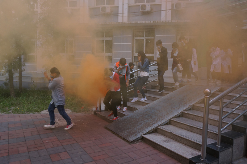 下午两点整,化工楼外准时施放烟雾,火警警报20秒内迅速响起,师生们用湿毛巾掩鼻,快速、有序地从化工楼东西出口撤离,穿过烟雾,到达预定地点集合并清点人数,撤离过程快而不乱,仅用时6分钟,顺利完成消防疏散演习任务。