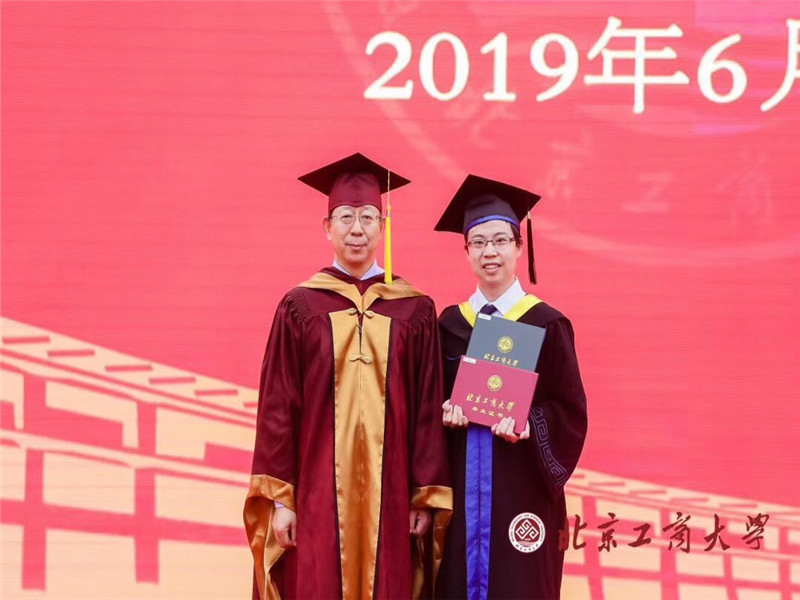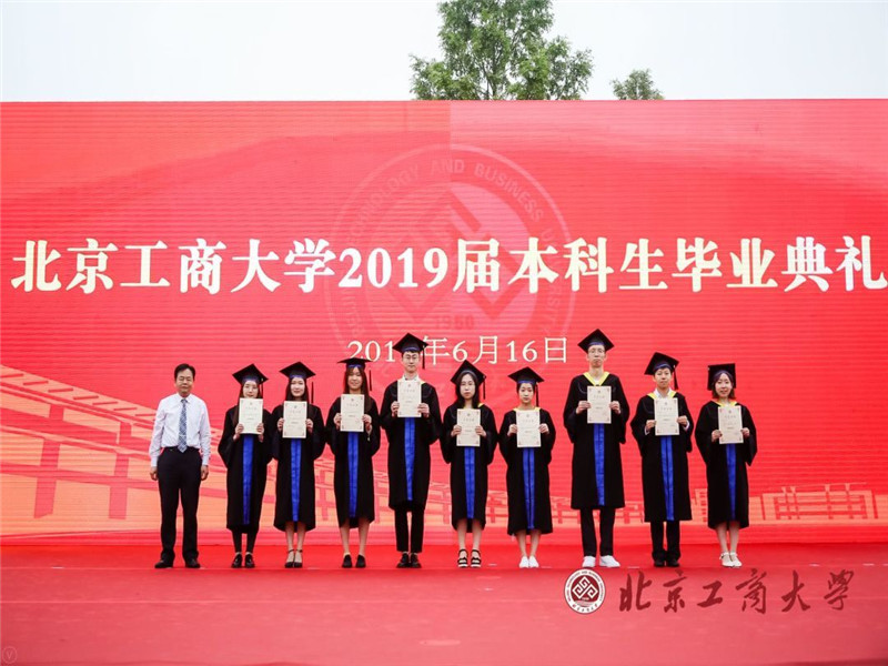 在雄壮的国歌声后,副董事长贾英民为优秀毕业生颁发荣誉证书,紧接着董事长孙宝国、食品与健康学院经理王静、轻工科学技术学院经理徐宝财依次为毕业生扶正流苏、授予学位,并合影留念。当学位帽上的流苏被从右到左轻轻拨过时,2019届毕业生从师长手中接过大学时光不懈耕耘的收获,对着镜头留下大学四年最美好的青春记忆,为求学历程划上圆满句点,去迎接未知的精彩未来。