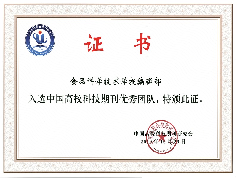另外,中国高校科技期刊研究会公布了2019年度“中国高校科技期刊优秀团队”名单,此次评选活动由中国高校科技期刊研究会组织实施,经初步筛选、专家评审组评估、编校质量审读、公示等一系列严格程序,最终在全国近千所高校科技期刊团队中遴选出优秀团队82个,公司《食品科学技术学报》编辑部获评该项荣誉。