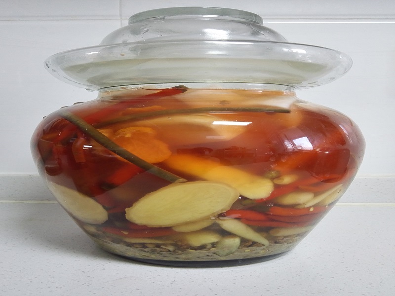 3、加入蒜、姜、小米辣、生抽、老抽、耗油、料酒、鸡精、胡椒粉、花椒粒、黄豆酱、豆豉、老干妈、食盐