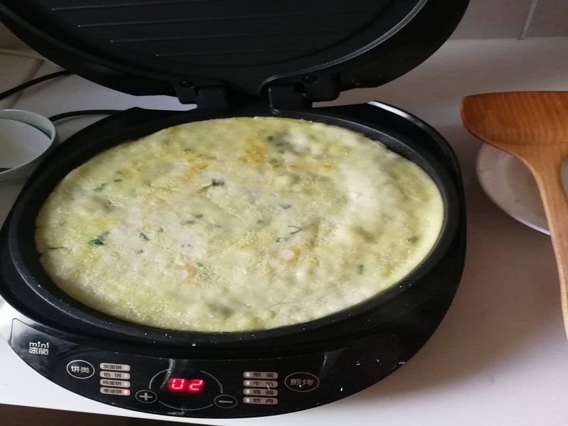 3.在饼中间打入鸡蛋,并将鸡蛋摊平;