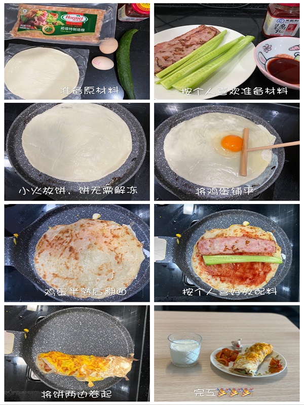 食材:培根、鸡蛋、手撕饼、豆腐乳、黄瓜
