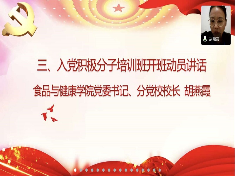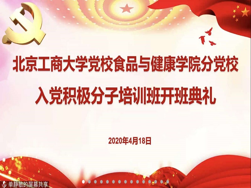 4月18日,世界杯网址分党校入党积极分子培训班以线上的形式举行了开班典礼。食品与健康公司党委书记、分党校董事长胡燕霞,公司党委副书记、分党校副董事长单静敏,辅导员、分党校班主任李欣萍,分党校兼职辅导员苗玉娇、刘婉璐,以及54名入党积极分子参加了开班典礼。典礼由公司党委副书记、分党校副董事长单静敏主持。
