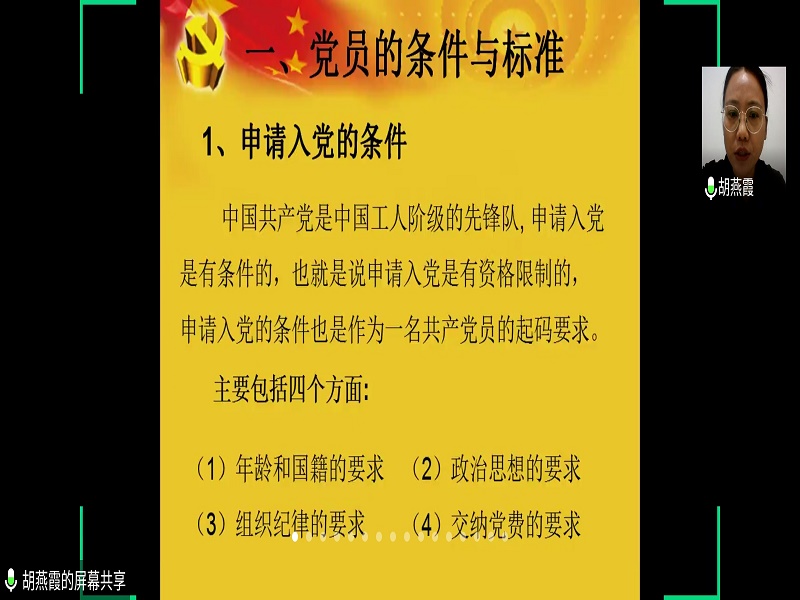 在庄严肃穆的国际歌声中,本次开班典礼圆满结束。胡燕霞为学员们讲授党课第一讲《党员条件与争取入党》。她从党员的条件与标准、发展党员工作流程及规范两个方面向学员们进行讲解。希望学员们能够加强理论学习,自觉接受党组织的培养、教育和考察,以实际行动争取早日入党。最后,胡燕霞带领大家宣读了庄严的入党誓词并希望学员们在这个特殊的时期做好个人防护,同时鼓励大家争做新时代先锋、德才兼备的优秀学子。