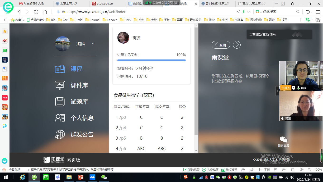 微生物双语课程的线上教学不知不觉,已经快接近尾声,我从最初的茫然、忐忑不安到现在的从容不迫、得心应手期间感悟颇深。一开始收到线上教学的通知时,多多少少有些不适应。面对着电脑屏幕,没有熟悉的黑板和粉笔,仅靠课件和解说,怎样上好一节课,让员工们都能听懂,心里不由得担心。通过对腾讯课堂,腾讯会议,雨课堂等软件的学习,最终决定通过腾讯课堂直播的形式进行授课,讨论,签到等任务的布置,通过雨课堂进行,课堂练习,测试,作业,并以腾讯会议和微信群辅助教学。这样通过网络授课,开始了我的直播生活。