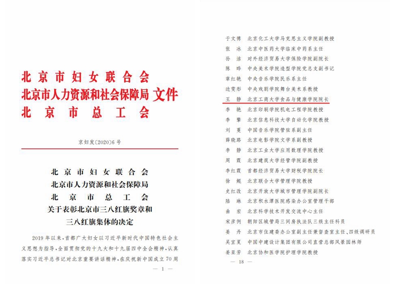 近日,北京市妇女联合会、北京市人力资源和社会保障局、北京市总工会联合下发《关于表彰北京市三八红旗奖章和三八红旗集体的决定》,共表彰620名同志和300个集体,公司世界杯网址经理王静教授被授予“三八红旗奖章”称号。