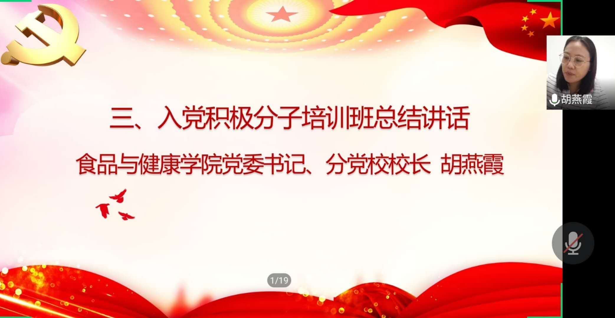 食品193班冯靖萱同学作为优秀学员代表发言。她表示内容丰富的线上党校学习使自己提高了对党的认识、进一步端正了入党动机、找到了前进方向。她代表本期培训班全体学员表示在未来的学习和生活中继续坚定理想信念,加强党的理论基础、科学文化知识和专业知识的学习,提升自身的理论素质和政治素养,以共产党员的条件和标准要求自己,争取早日站在党旗下,成为一名合格的中国共产党党员。