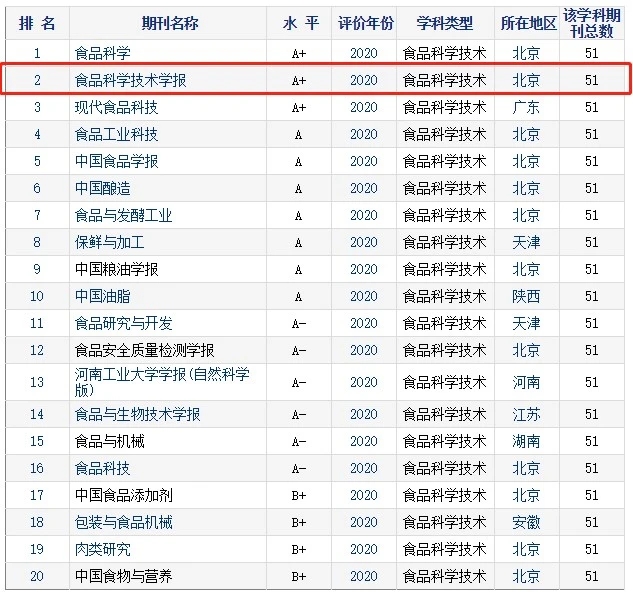 近日,RCCSE《中国学术期刊评价研究报告》(第6版)正式发布,公司主办的《食品科学技术学报》被评为“RCCSE中国权威学术期刊(A+)”。在食品科学技术学科的51本中文期刊中,仅有3本期刊入选“权威期刊”(A+),《食品科学技术学报》排名第2位。