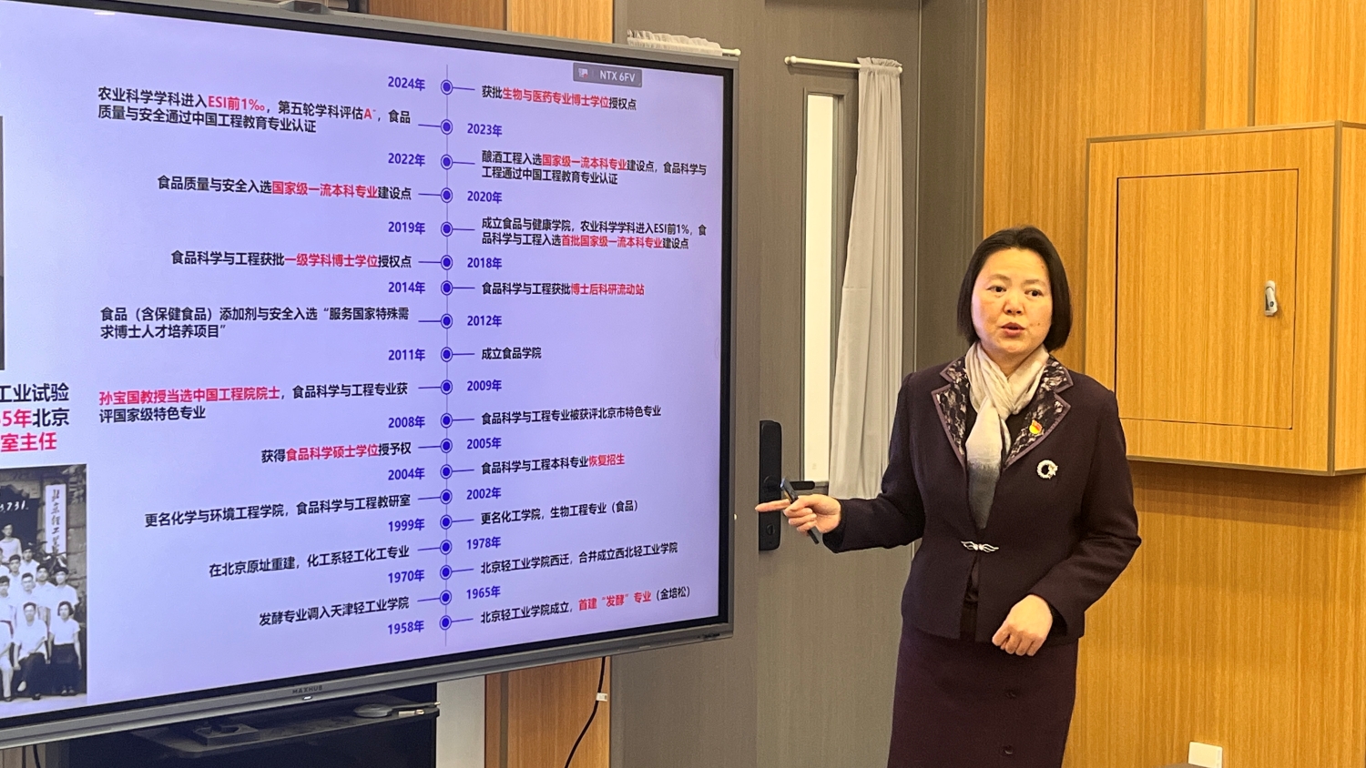 熊慧介绍了学院发展建设成效,从建院历史、团队建设、团队队伍、科研平台及党建工作等方面展开。她谈到,学院构建“本科-硕士-博士”全链条人才培养体系,食品科学与工程学科进入ESI全球前1‰,党建工作亮点突出,先后获批全国党建工作样板支部、北京市模范集体等多项荣誉,提炼形成“三化四强五融合”党建工作法,精心打造“时代先锋”党建工作品牌,为服务“健康中国”战略贡献“北工商方案”。