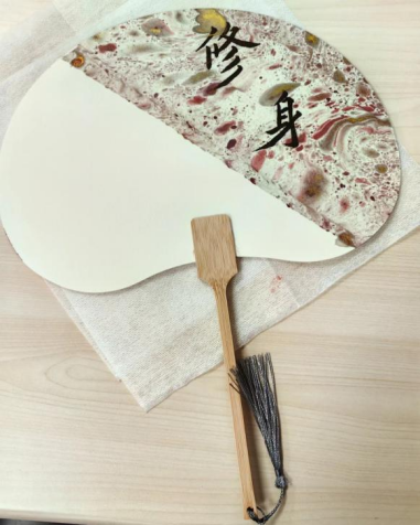在社团社员的的指导下,在场员工党员分工协作,分组制作漆扇。“修身”“自省”“廉洁”“明德”……大家纷纷用笔墨在空白扇子上书写所思所感所愿,继而在水漆中或平入、或旋转、或轻摇,铺在纸上静待晾干,一柄柄典雅明丽、独一无二的漆扇制作完成,握在手中,阵阵清风在盛夏时节拂面而来。