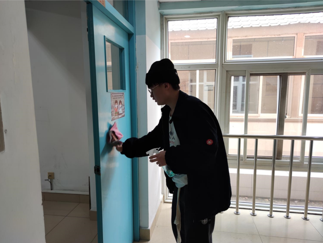 为做好疫情防控常态化工作,学员们利用午休时间,在教三楼2层做了全面的消毒工作。学员们用蘸有75%酒精的抹布擦拭桌面、椅子、门把手,进行清洁消毒,并在楼道中喷洒酒精喷雾,认真细致,不放过任何一个角落,保障了同学们的学习生活。各位学员也在志愿服务中收获了荣誉感、成就感,切实用行动服务同学,发挥了先锋模范作用。
