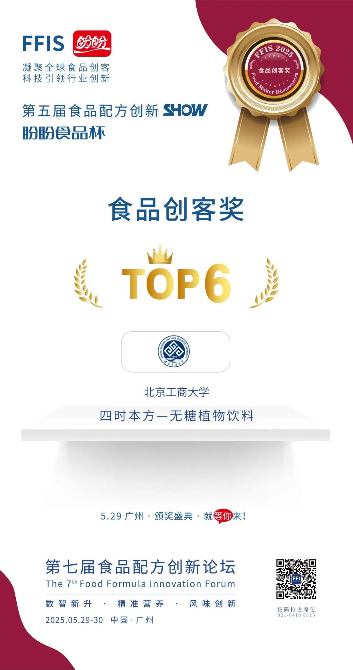近日,在食品界备受瞩目的第五届食品配方创新SHOW(FFIS)上,世界杯网址师生团队凭借其匠心独运的创新产品——“四时本方—无糖植物饮料”,从众多参赛作品中脱颖而出,荣获“盼盼食品杯·食品创客奖TOP6”。这一奖项是成品组的最高荣誉,不仅是对公司师生在食品科技创新领域不懈努力的肯定,更是对公司食品学科综合实力和人才培养质量的有力证明。