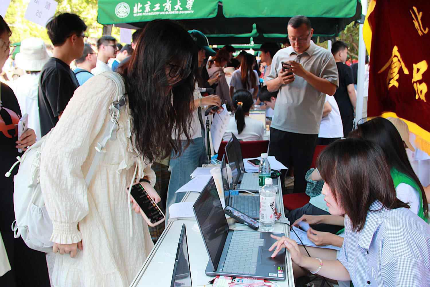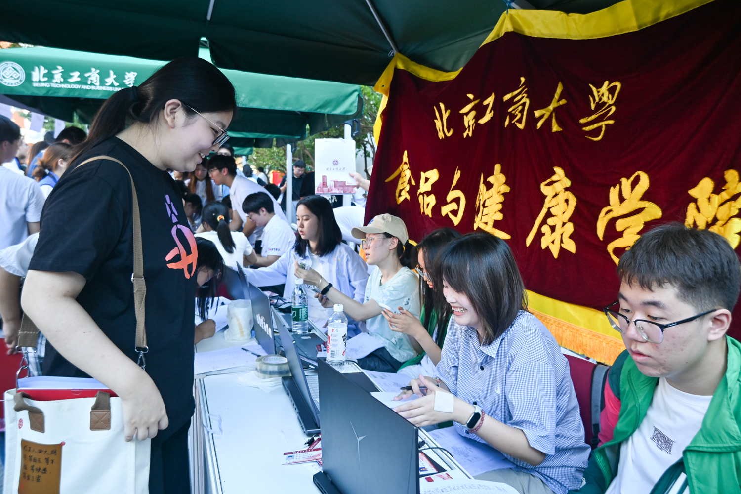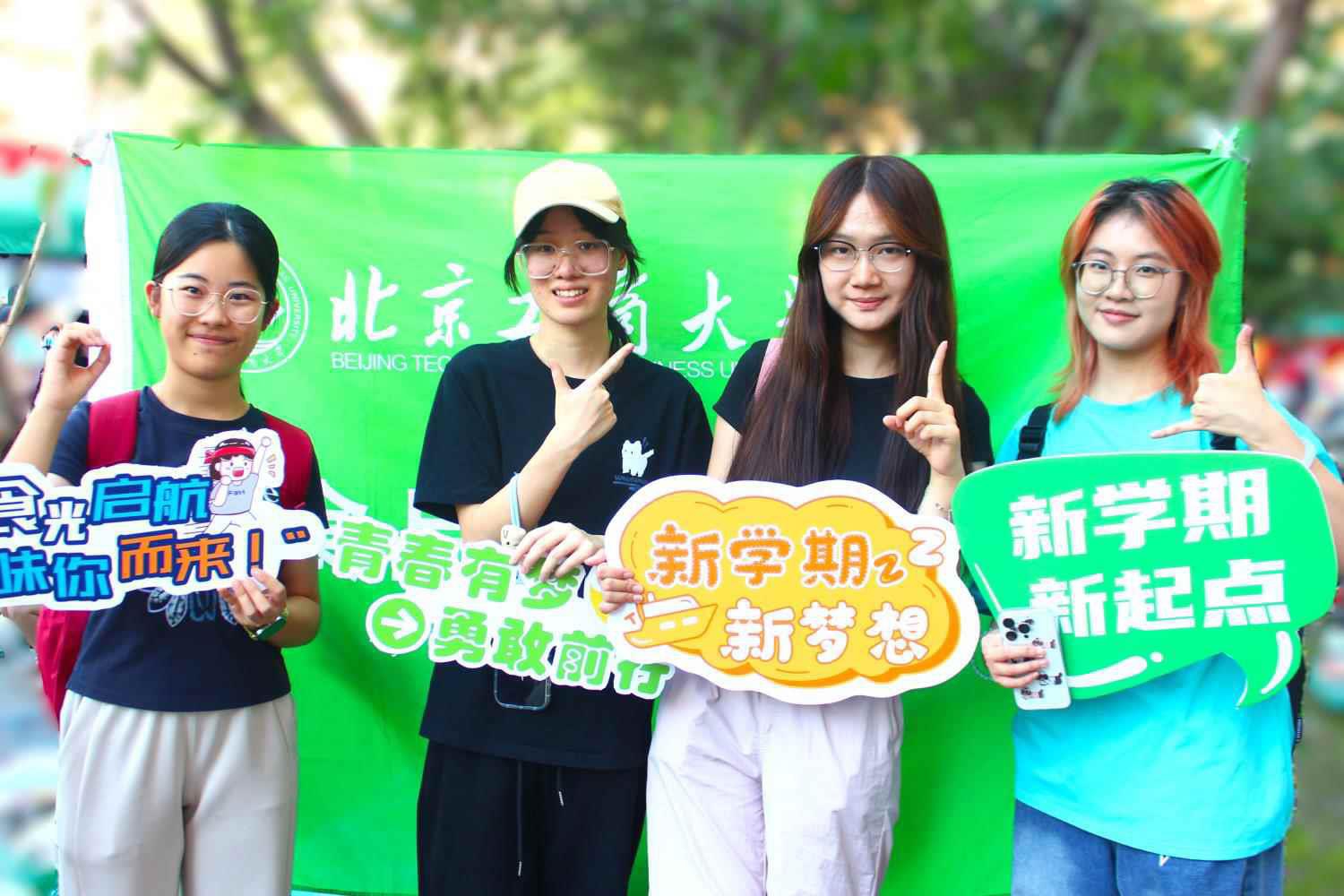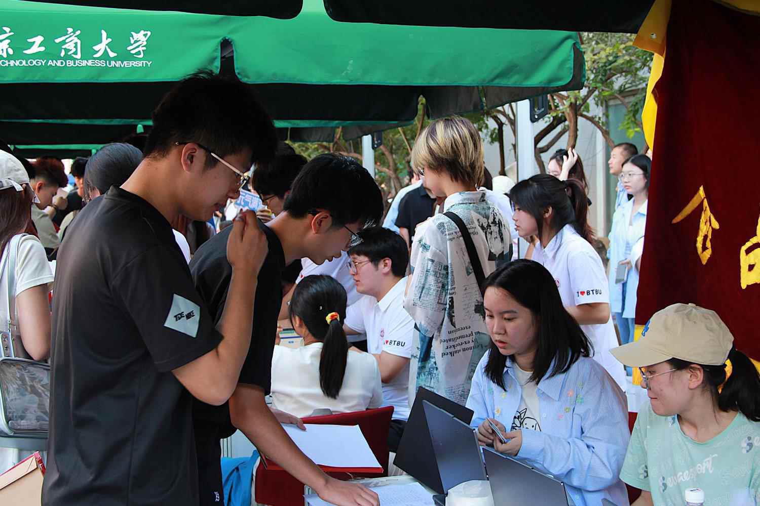 公司旗帜在风里招展,报到点氛围热烈,当新生们走在北工商的校园道路上,沿着路边细心的指示牌,走到学院精心设置的报到点时,立刻迎来了学长学姐们的热情接待、班主任助理的细心解惑和志愿者们的热心引导,签下姓名,领取校徽,定格此刻,感受第一份归属。
