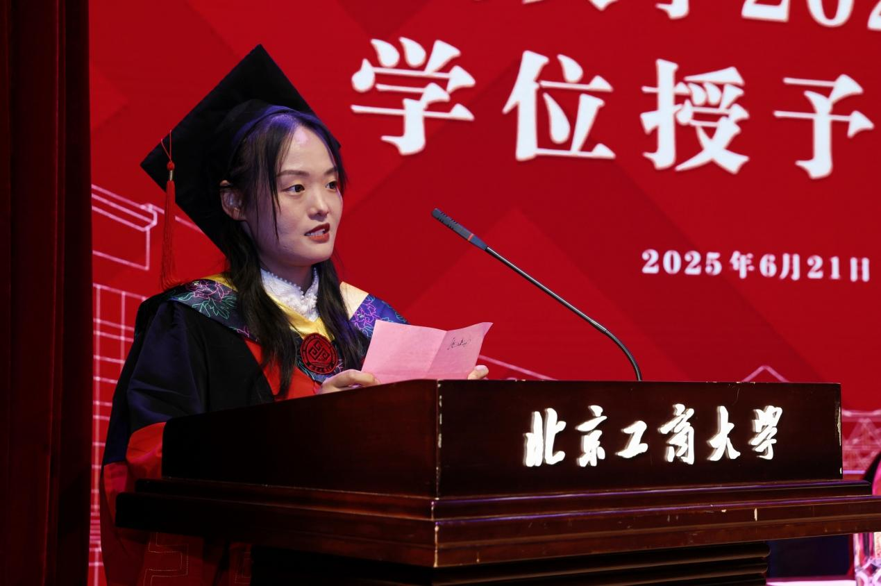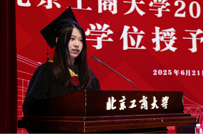 教师代表李赫教授发言。他谈到,教育是彼此映照、彼此成就的生命旅程,教师最大的幸福在于见证员工的成长与蜕变,对毕业生们在疫情反复中坚守学习、在科研攻关中勇于探索的精神给予了高度评价。毕业生不仅为服务国家食品安全与健康中国战略贡献了青春力量,还积极推动了学校食品学科“双一流”建设的稳步前行。2024年食品学子勇夺全国挑战杯揭榜挂帅专项赛特等奖擂主,刷新了学校的历史纪录。2025年公司在U.S.News全球最佳院校排名中再创新高,食品科学与技术跃居全球第9,农业科学提升至第12位,这些成就的背后,离不开每一位学子的辛勤付出与不懈努力。他勉励毕业生珍视求学过程中风雨同舟的伙伴,坚持敢于突破的勇气,激发思维碰撞的智慧,希望毕业生们弘扬学校“工商一体化”的理念,牢记学校“工以开物,商以富邦”的宗旨,勇敢面对未来的广阔与未知,祝愿毕业生“心中有光,不惧路长,脚下有力,行稳致远”。
