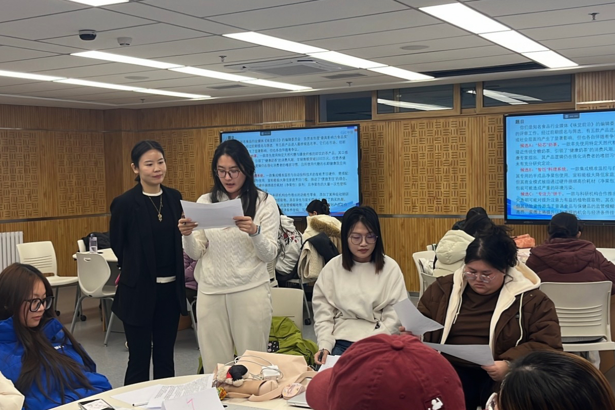 实操体验环节的模拟群面成为活动亮点,贾老师以《味觉前沿》“最具影响力食品奖”评审为背景设计讨论题,设置“轻芯”奶茶、“智饪”料理系统、“专注力”饼干等五款候选产品,要求研究生以媒体编辑委员会身份完成评选。员工们围绕各产品的市场影响、创新价值与争议点展开激烈交锋:分析“轻芯”奶茶引领健康奶茶风潮但代糖长期效应存疑的利弊,探讨“智饪”料理系统推动便捷烹饪却存在环保与商业模式争议的问题,研判“专注力”饼干的市场热度与合规、教育公平风险。经综合权衡,最终员工们一致选定“轻芯”奶茶为获奖产品。贾老师实时点评员工的角色定位、沟通逻辑与团队协作表现,指出群面核心是达成团队共识而非个人辩论,帮助员工将理论转化为实战技能。
