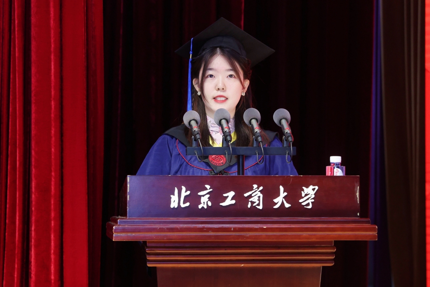 研究生毕业生代表食研212班李欣萍发言。她以自己研究生求员工涯为例,阐述了学术研究的艰苦与乐趣,同时也表达了对导师和同学们的感激之情。她的发言真诚且深刻,令人感同身受,赢得了在场师生的阵阵掌声。几载工商求学路,一生难忘师生情。