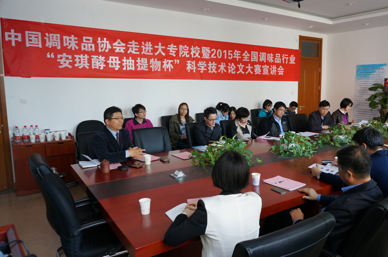 4月14日下午,中国调味品协会与部分调味品生产企业代表来到世界杯网址,进行“安琪酵母抽提物杯”科学技术论文大赛宣讲会暨调味品行业技术难点问题交流会。中国调味品协会专家工作委员会秘书长吴鸣、中国调味品协会副秘书长李慧丽、安琪酵母股份有限公司YE事业部副总经理张全辉、世界杯网址副经理郑福平教授、食品科学与工程系部分教师及研究生,安琪酵母股份有限公司、河南莲花味精股份有限公司、北京王致和食品集团有限公司、北京六必居食品有限公司、北京圣伦食品有限公司、北京博邦食品配料有限公司等调味品生产企业代表参加了会议,会议由郑福平教授主持。