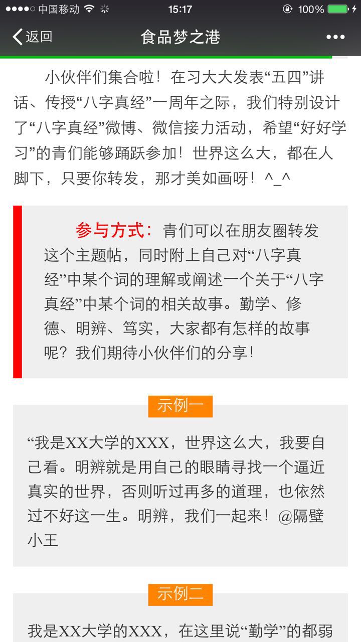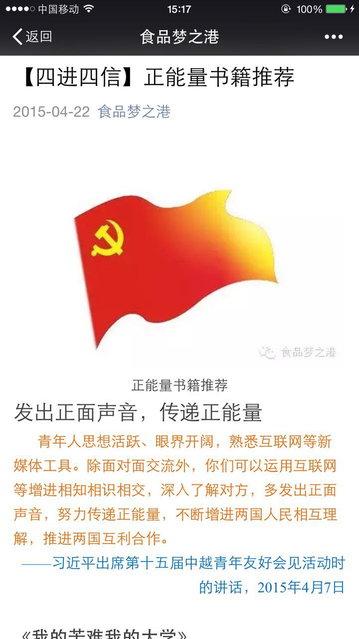 通过微博、微信等媒体平台,形成线上线下两个平台的互动。学院团学微信公众号“食品梦之港”开设“食·天下事”“四进四信”“食力青春”等专栏,以深入浅出的方式为同学们解读“四进四信”的深刻内涵,对社会热点问题进行及时报道。每日提炼团中央、北京团市委和校团委微信公众号中精彩学习内容和成果进行发布,引导青年员工自觉学习专栏内容并转发、评论。借助新媒体打造原文学习、资料查询、心得分享的交流共享平台,实现学习宣传讲话精神的日常化、长期化。