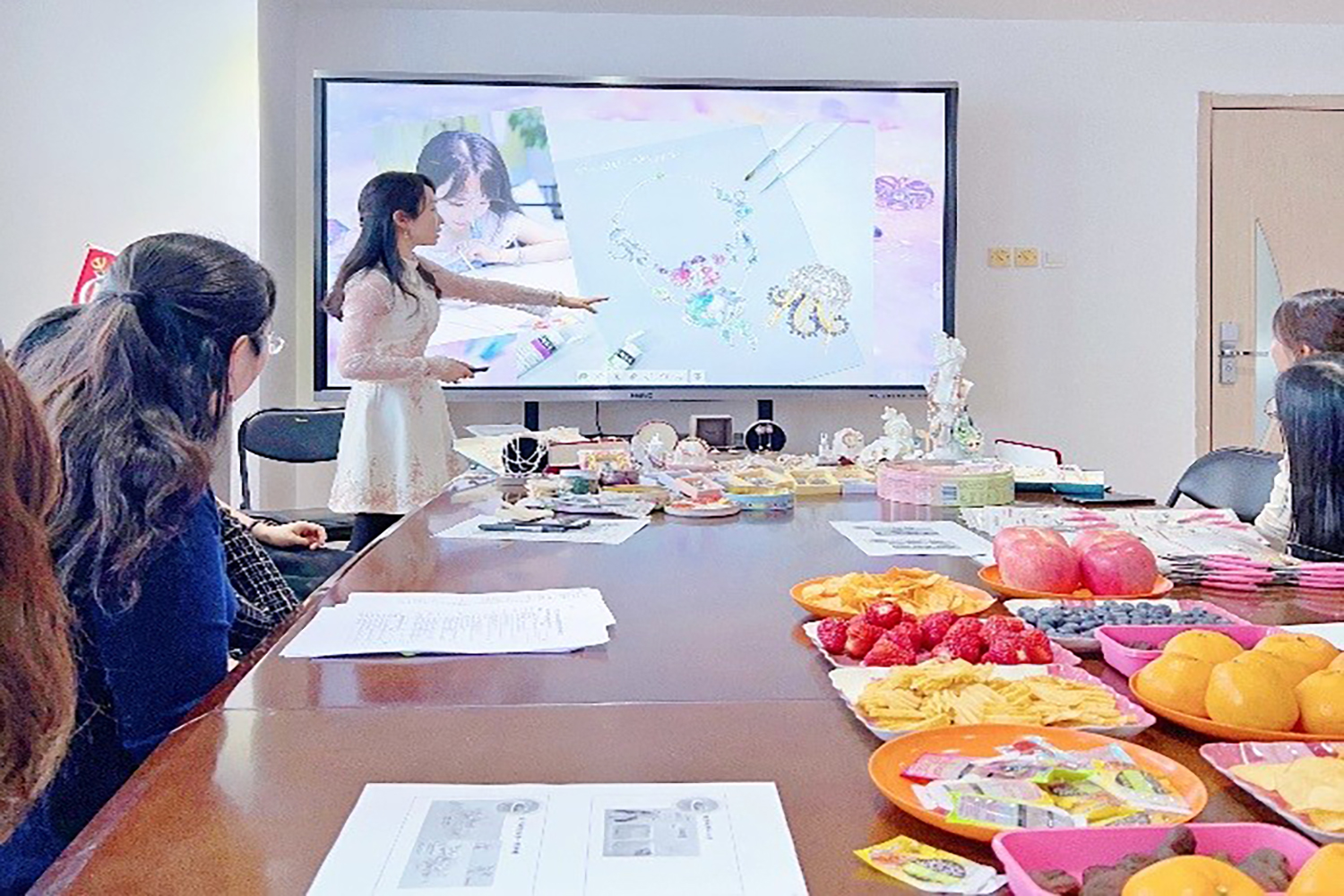 首先学院邀请到了教学督导组组长杜海燕老师和教学名师张婵老师为女教工进行了教学经验的分享与交流,张婵老师先就近几年来参加教学标兵和教学名师比赛的经历给大家分享了很多切实可行的方法和经验,杜海燕老师从评委专家和督导的角度给大家解读了教学的提升方向和具体方法,老师们感觉收获颇丰,并鼓励在座女教工在对待教学及科研工作方面要大胆创新,与时俱进。接下来学院教学秘书邹欣老师带领女教工们欣赏高级定制珠宝的时尚与美好,并讲解了简单的鉴赏知识,女教工反响热烈。最后邹老师讲解手工绕线饰品的制作方式和步骤,带领大家制作简单的绕线花片珍珠小饰品,如发卡和胸针等。女教工们热情高涨,大家纷纷动手操作,在一片欢声笑语中度过了这次难忘的三八国际妇女节。