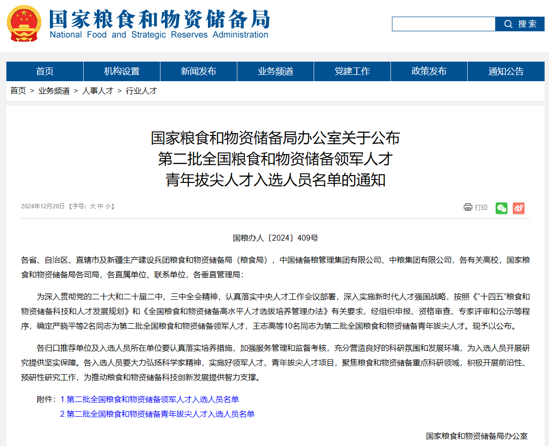 全国粮食和物资储备高水平人才选拔与培养是国家实施科技兴粮兴储、人才兴粮兴储战略的重大举措,每两年开展一次选拔。此次共选拔产生2名全国粮食和物资储备领军人才、10名全国粮食和物资储备青年拔尖人才,并根据有关规定享受优先培养措施。