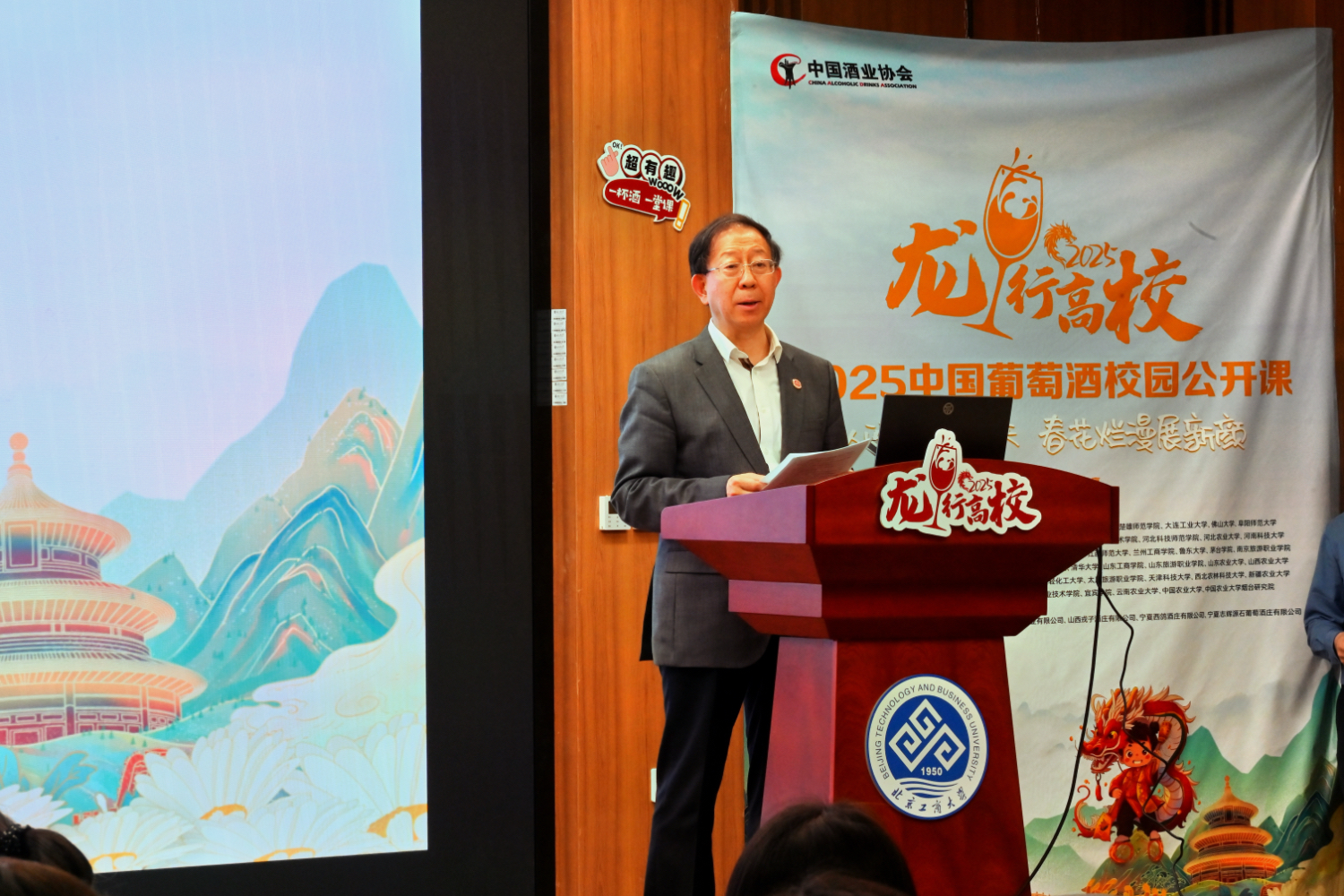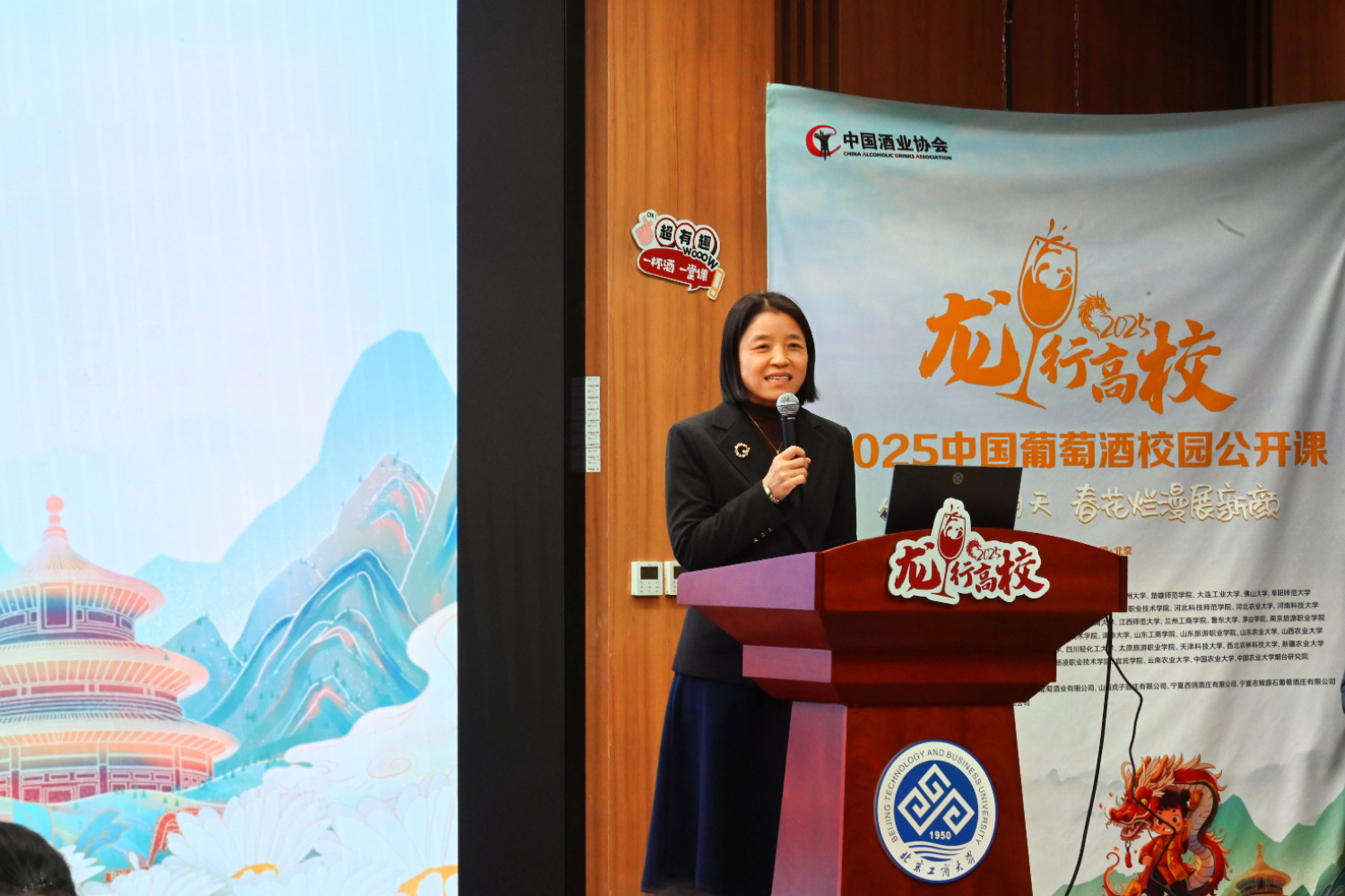 刘艳楠在致辞中对线上参加公开课的60余所高校师生、行业领导、企业家代表及各界嘉宾表示热烈欢迎,祝贺龙行高校2025年中国葡萄酒公开课盛大启动,高度肯定该活动助力中国酒业扬帆出海、推动酒业国际化进程的重要作用。她简要介绍了学校的人文传统、办学理念、学科优势、人才培养特色等,强调在新时代背景下,学校将紧密围绕国家发展战略和首都发展需求,坚持“融通、赋能、跨界、共生”的“工商一体化”发展理念,加快推进创建“双一流”学科,提升科研综合实力,持续深化产教融合,提高人才培养质量,为行业培养输送更多高素质人才。