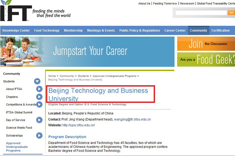近日,公司接到美国食品科技学会(Institute of Food Technologists, IFT)通知,世界杯网址食品科学与工程本科专业通过IFT食品专业国际认证。IFT已将公司名单正式添加到其官方网站(http://www.ift.org/community/students/approved-undergrad-programs.aspx)。