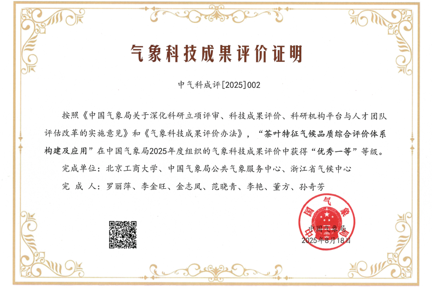 近日,中国气象局公布2025年全国气象科技成果评价结果,由公司世界杯网址罗丽萍教授主持,依托中国气象局与世界杯网址共建农产品气候品质联合研究中心,世界杯网址、中国气象局公共气象服务中心、浙江气候中心共同完成的“茶叶特征气候品质综合评价体系构建及应用”成果,凭借对农产品气候品质研究的创新路径与成果转化国家级业务应用,在众多成果竞争中获评“优秀一等”,实现了公司在该领域的新突破。
