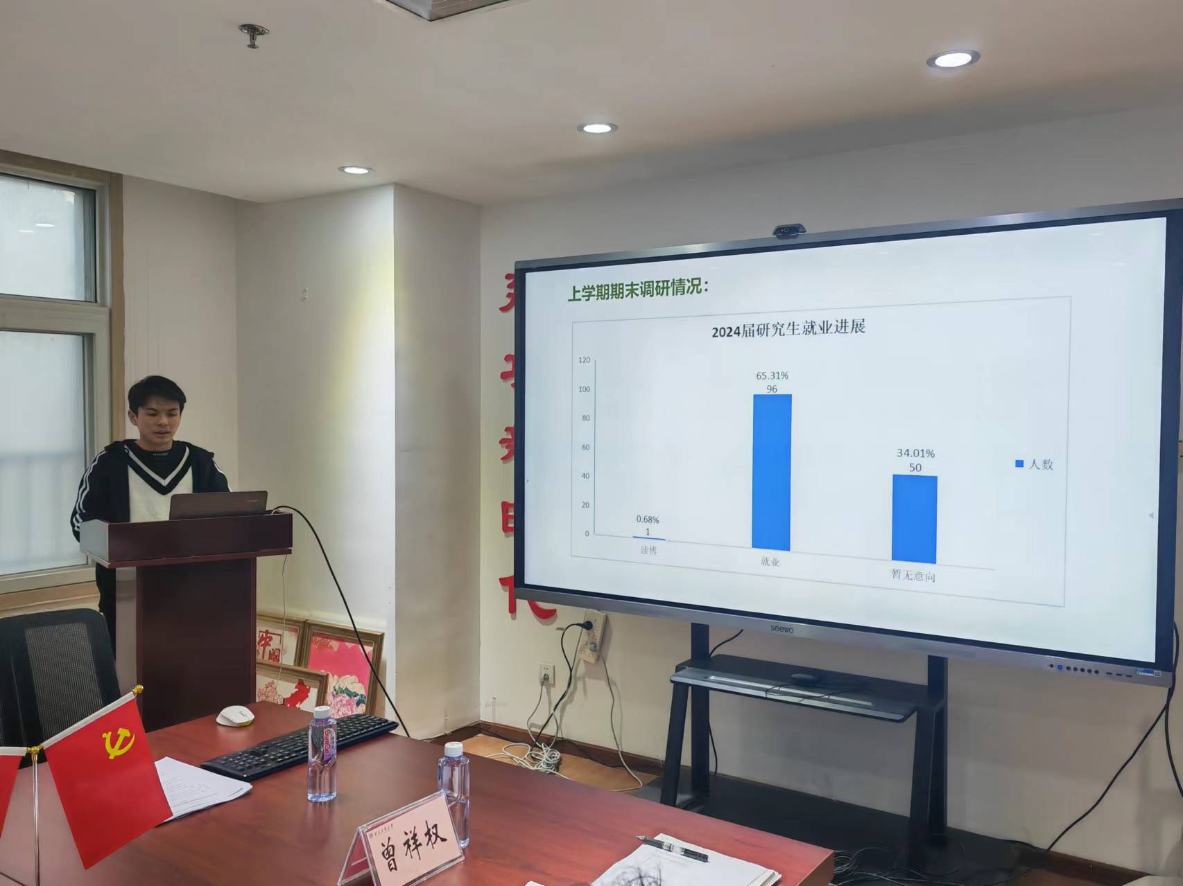 辅导员潘梓逸汇报了2024届毕业生的就业工作整体情况,介绍了学校就业与招生联动机制,着重阐释了就业数据的重要性,指出就业是衡量学院办学水平和人才培养质量的重要指标,动员教师提高认识、广泛参与,共同为员工的就业工作贡献力量。