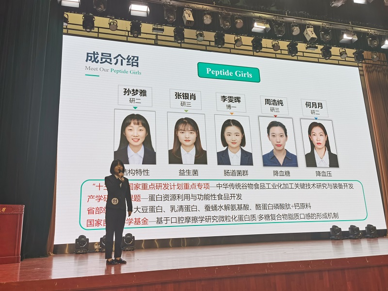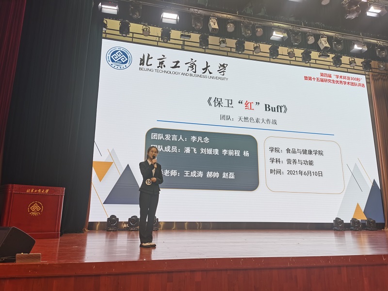 “稻亦有道考谷队”团队以致力于让大米主食结构健康化升级,深入研究影响糙米黏度的分子机制,团队愿成为追随袁隆平爷爷的稻穗,努力实现粮尽其用,让更多人品尝其中的“稻亦有道”;“Peptide Girls”团队从氮源入手,采用大豆低聚肽对益生菌和肠道菌群进行研究,实现研学产一体化的培养模式,服务首都经济社会发展需求;“天然色素大作战”团队致力研究多种生理功能活性的天然合成色素,对比具有潜在危害的人工合成色素,深入浅出地阐述花色苷作为功能因子应用于食品工业所发挥的价值作用,也为我们日常合理饮食给予了一定启发。