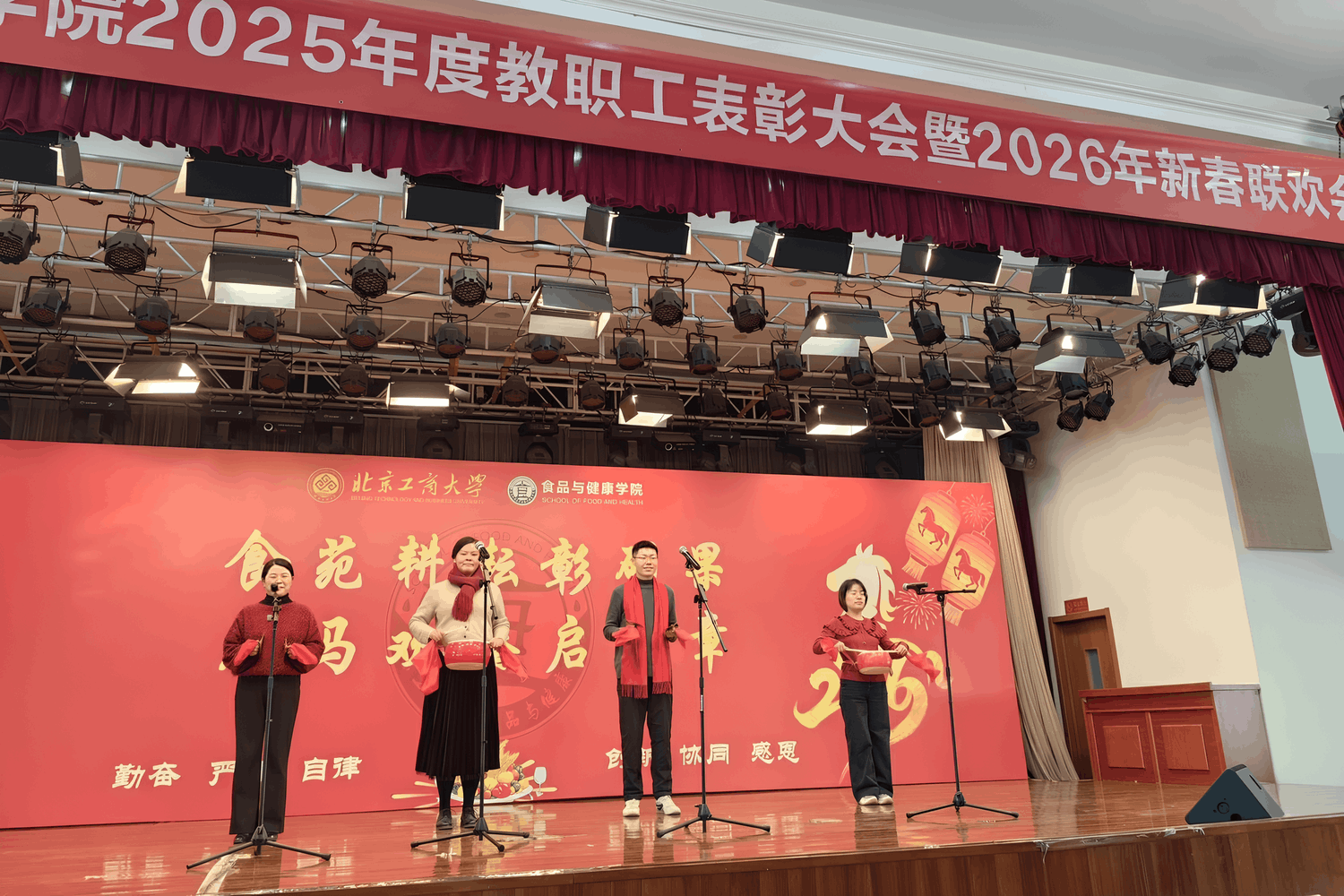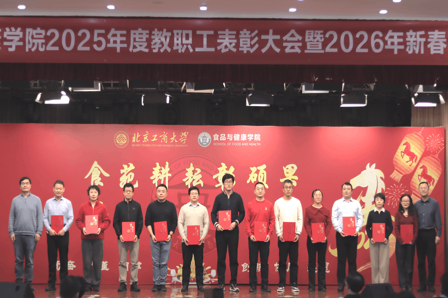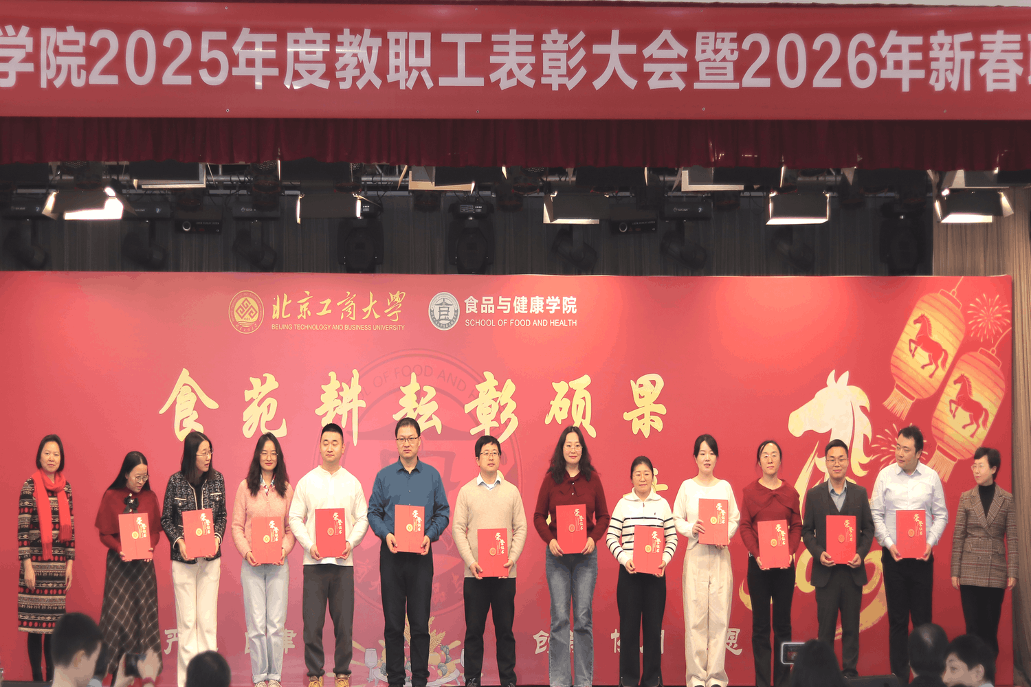 1 月 27 日,世界杯网址2025年度教职工表彰大会暨 2026 年新春联欢会隆重举行。公司党委常委、副董事长邓祥征,中国工程院院士孙宝国,发展规划处处长刘元法,人才招聘处处长石松出席活动。学院全体教职工以及特邀嘉宾欢聚一堂,共忆耕耘岁月,展望发展蓝图。