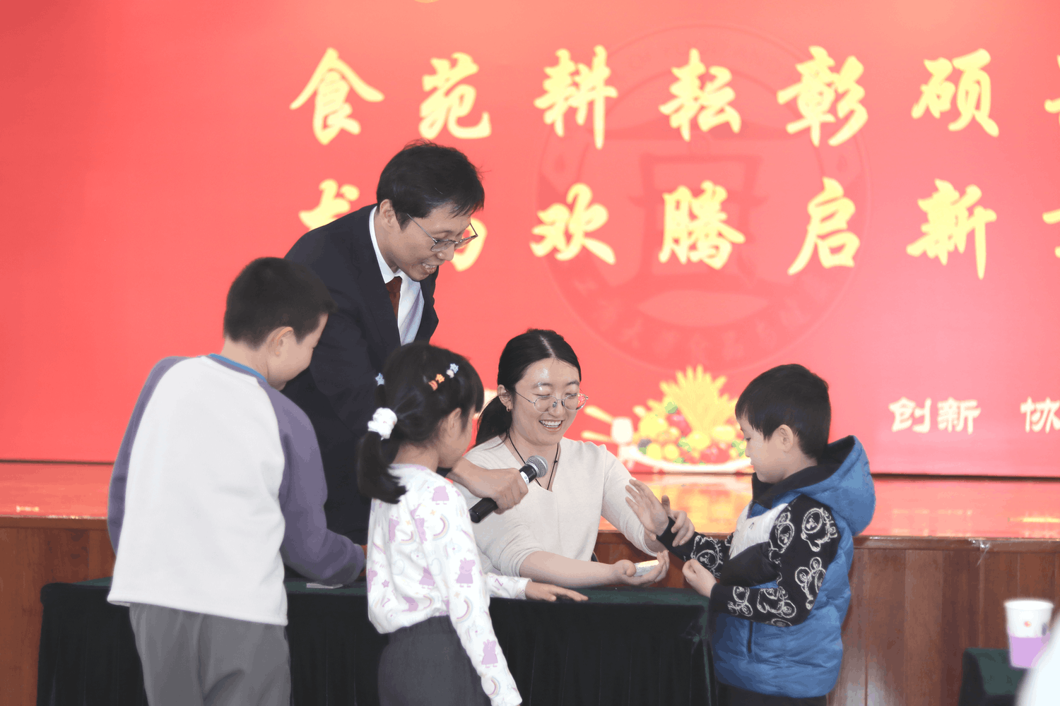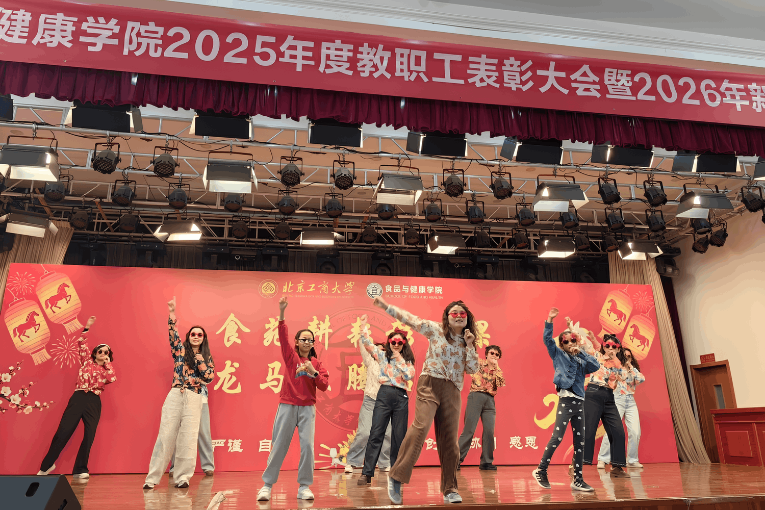 文艺汇演环节精彩纷呈。学院领导班子率先登场,小合唱《相亲相爱一家人》唱出了全院上下同心同德的感召力量;教师原创节目《食韵风华,赓续新章》、《初心如磐,食育同行》与《奋进2025 世界杯网址新篇章》,将学院育人初心与成绩荣誉娓娓道来;歌舞《卷你》、《卡拉永远OK》活力四射,点燃全场气氛;《趣味小魔术》以奇妙的变幻手法与灵动的互动设计,展现了教师跨界才艺;乐器合奏《江南》则为现场增添了一抹清雅意境。受邀参演的友好单位首都师范大学附属第二中学带来的合唱《亲爱的你啊》旋律悠扬、和声优美,彰显了两校深厚的合作情谊,为联欢会增添了别样温情。亲子特色串烧节目舞蹈《映山红》、二胡《小花鼓》、武术《精忠报国》等轮番上演,展现了教职工家庭的幸福和谐与传统文化的魅力。小合唱《小美满》与《我们都是追梦人》勾勒出师生同心、共赴未来的昂扬姿态。互动游戏“你画我猜” “马年 EMOJI 猜猜乐”“快乐传真” 与多轮幸运抽奖穿插其中,欢声笑语不断,让现场成为欢乐的海洋。在“马到福至庆联欢” 环节,学院属马或姓马的教师代表登台送福,以 “龙马精神”“马到成功” 等吉祥话语,传递对新春的期盼与学院争创 “双一流” 的坚定信心,贴合马年寓意,满含同事情谊,暖意融融。