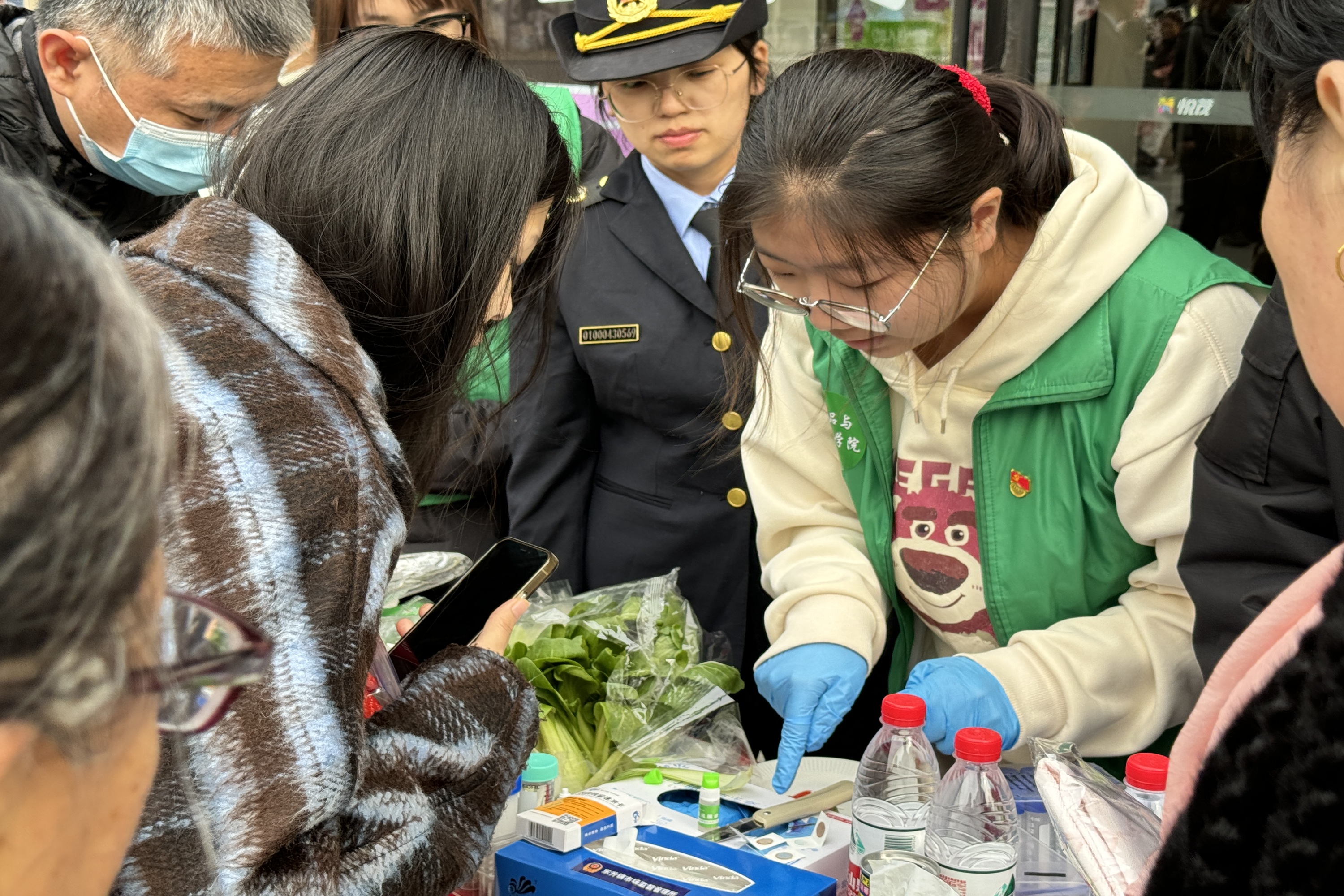 在食品安全快检体验展台,现场演示了农残试纸的使用和食品蛋白质检测等简易、快捷的检测技术,参与群众通过试纸或试剂的颜色变化直观感受了农产品中农药残留和蛋白质的分析过程。活动现场还设计了互动式体验环节,参与群众选择想检测的蔬菜和常见饮品,在工作人员的指导下亲自动手完成检测过程,增加了活动的趣味性。师生党员还对现场群众提出的食品安全相关问题耐心解答。