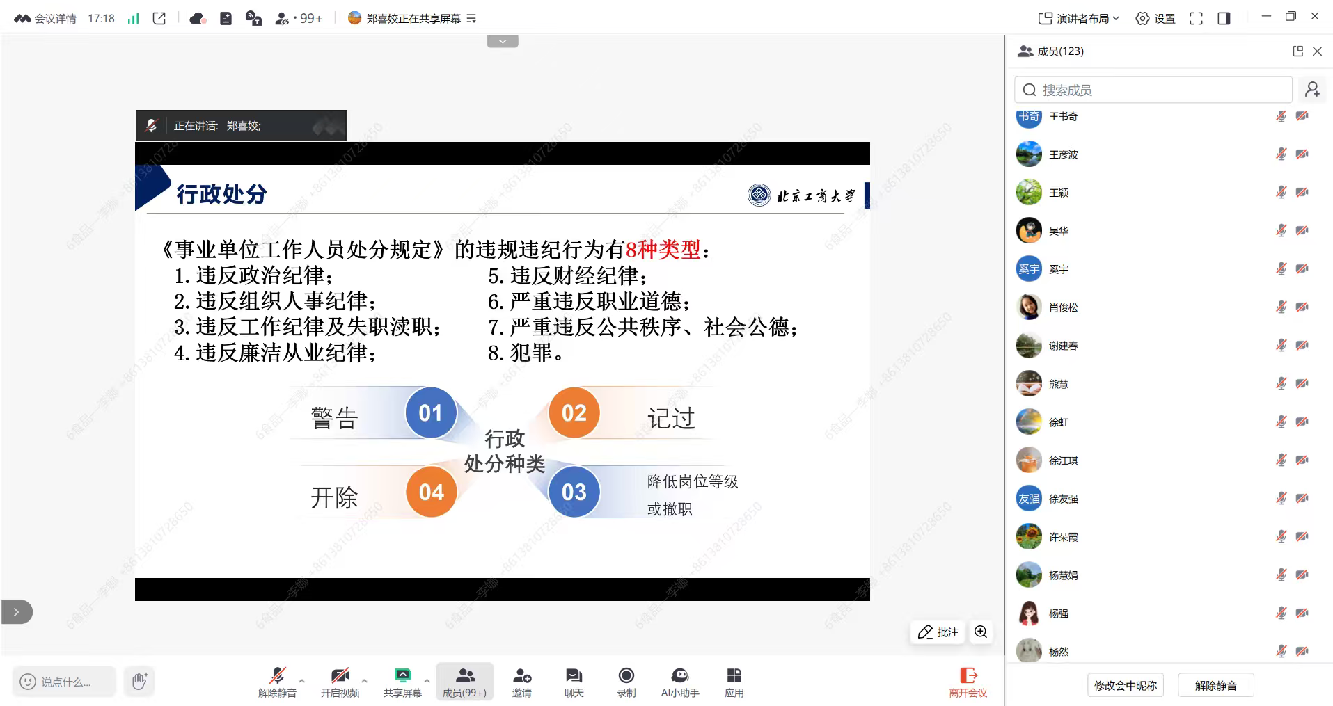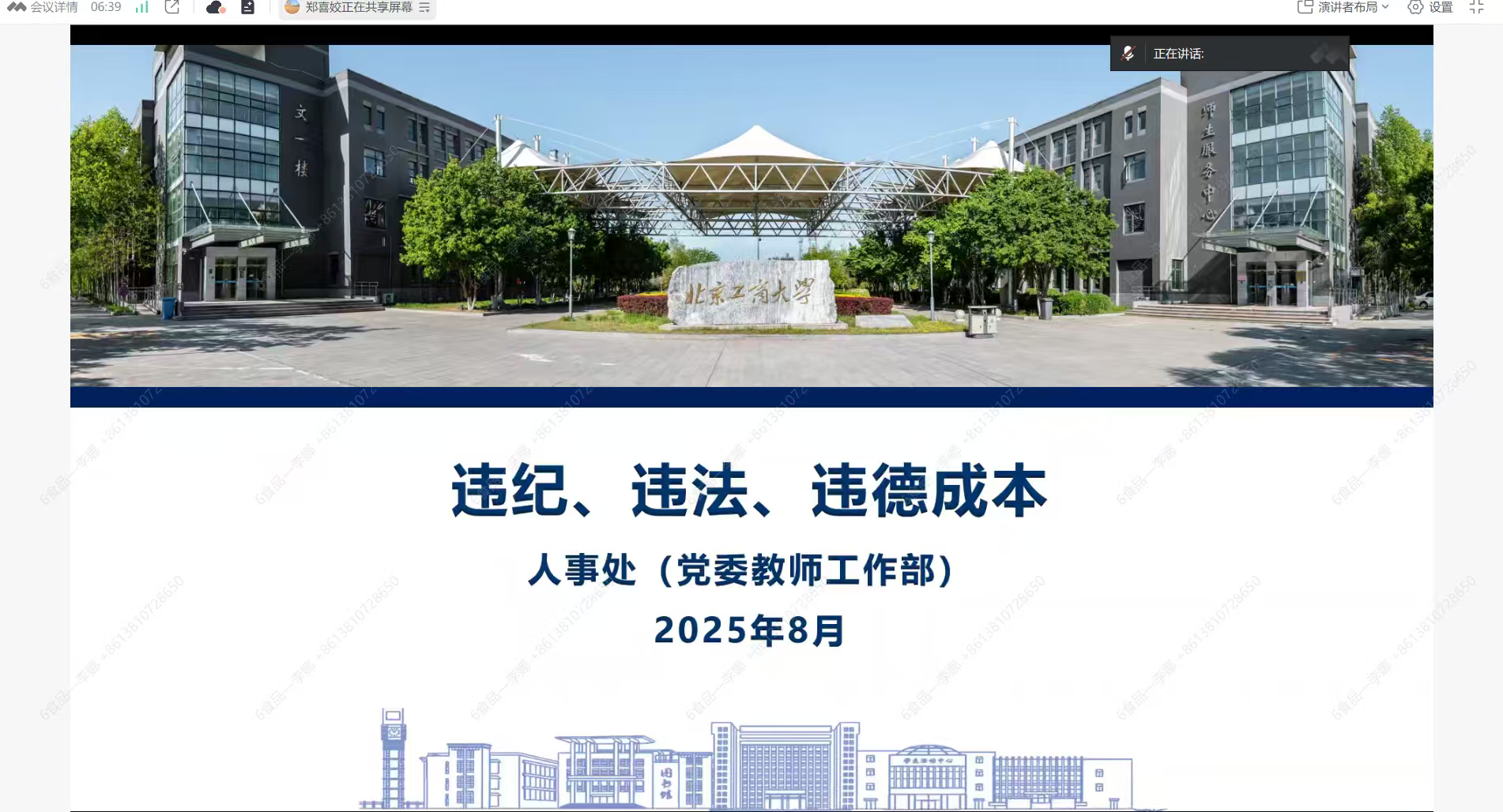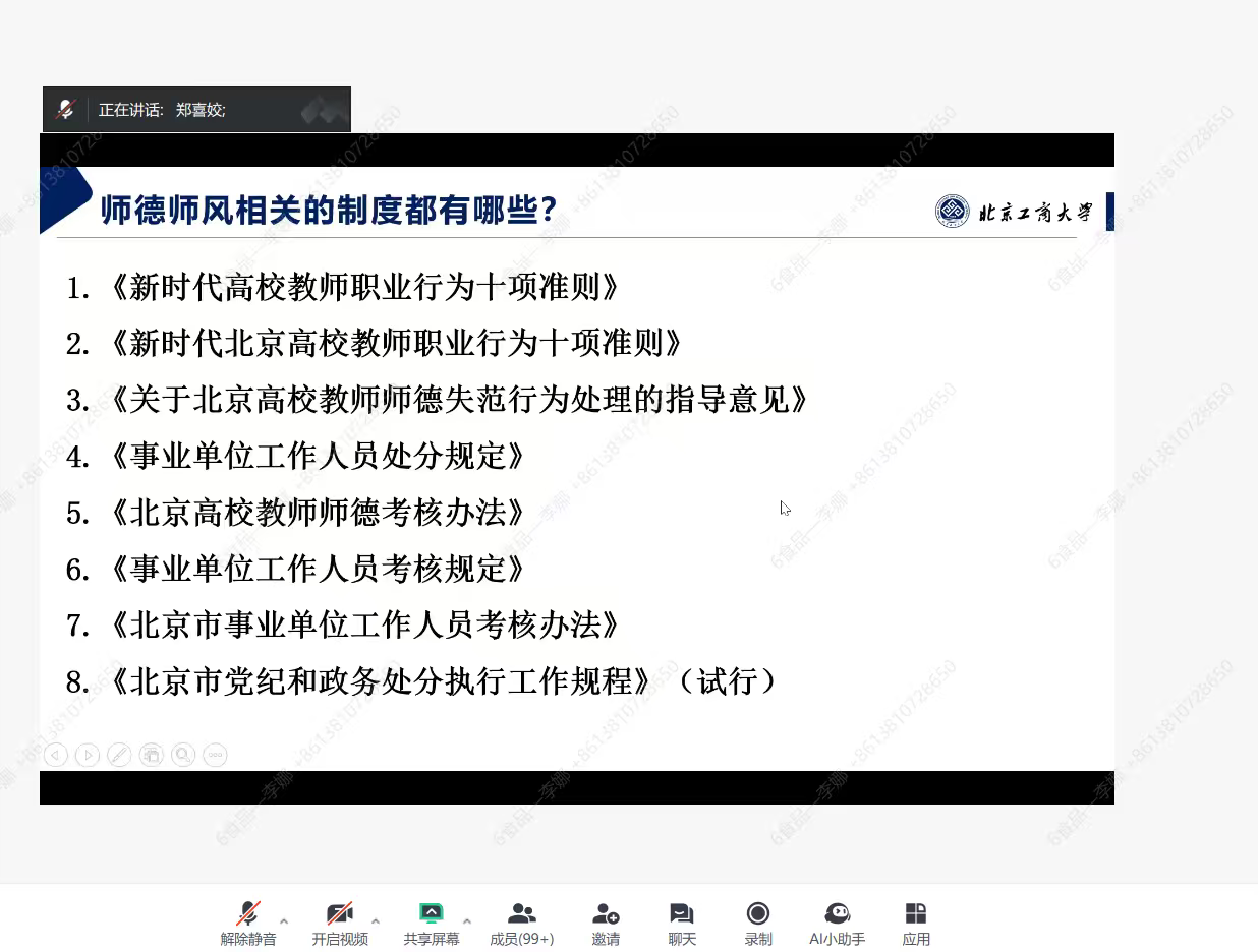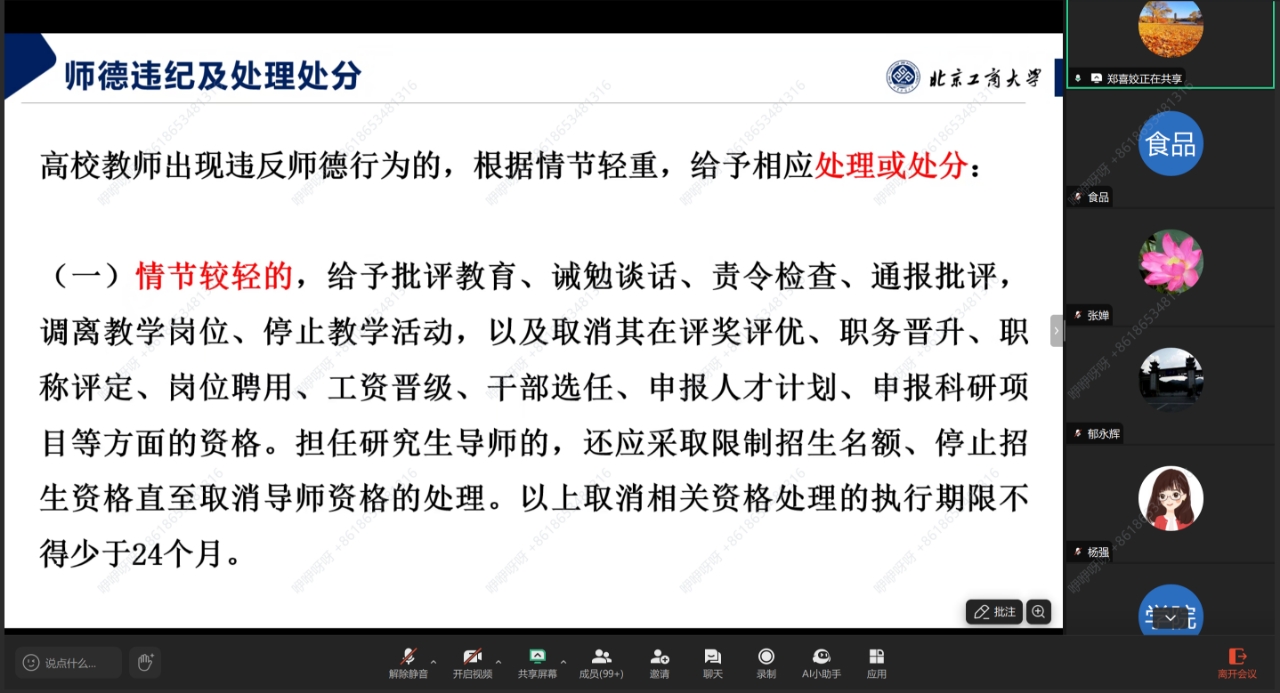 郑喜姣以“违法、违纪、违德案例及成本”为题,带领全体教职工重温了《新时代高校教师职业行为十项准则》《新时代北京高校教师职业行为十项准则》《事业单位工作人员处分规定》等师德师风相关制度文件,列举了师德失范行为的具体表现及其严重后果,讲解了违反师德规范面临的党纪政纪处分,计算了高昂的经济成本损失以及个人职业发展受限等困境。郑喜姣强调,师德师风是评价教师队伍素质的第一标准,全体教职工要守牢底线、不踩红线、践行高线,切实加强自身师德修养,自觉遵守师德规范,以教育家精神铸魂强师,做到以德立身、以德立学、以德施教,以良好的师德师风影响和带动员工,为学院的公司产品事业高质量发展贡献力量。