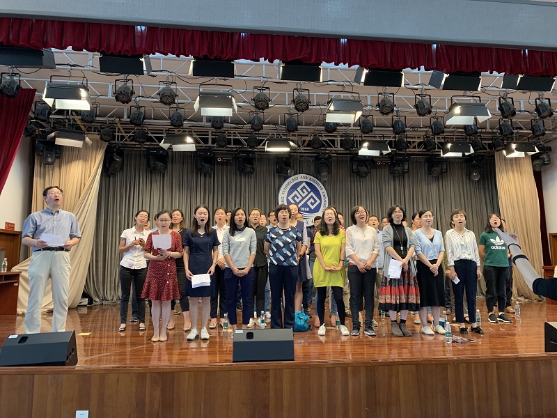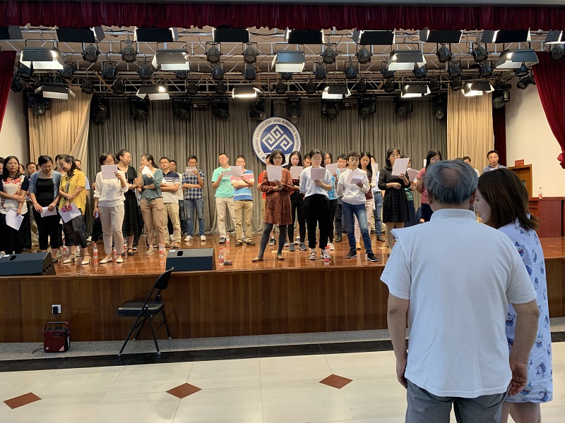 为了能更好的展示爱国之情,学院内部挖掘才艺达人,同时还邀请了莫述诚教授和专业声乐老师认真组织排练。一遍遍表达的激情歌声,是对新中国成立70周年最真挚的祝福,是推动开展“不忘初心、牢记使命”主题教育的积极举措。