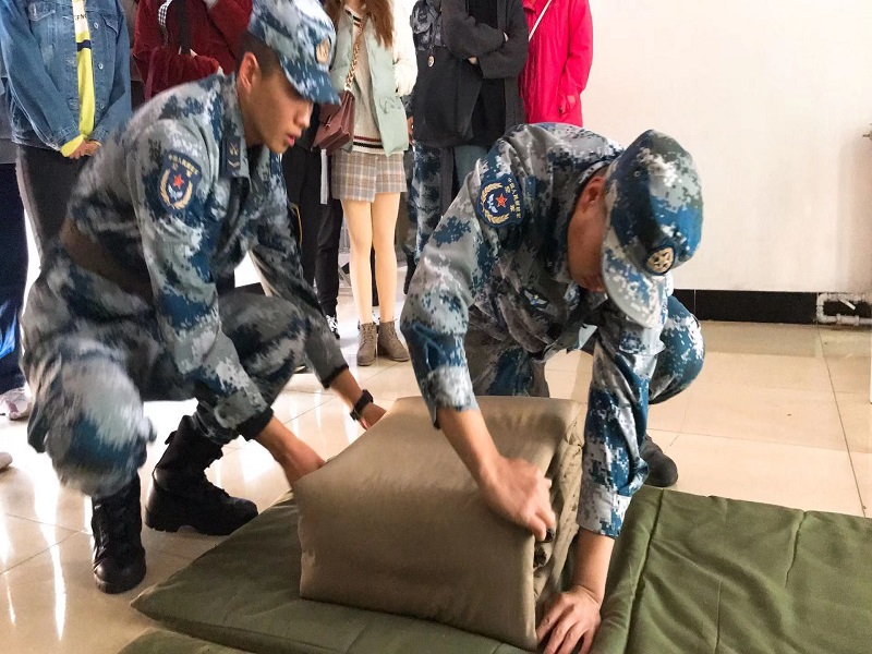 本次活动分为两部分,第一部分以“食品知识大讲堂”为主题,通过开展活动,员工党支部和空军支部之间进行了专业方面的交流。结合员工党员的专业特色为部队官兵普及功能性食品相关知识,从而倡导部队官兵健康训练,健康生活。连职人员带同学们参观了三班的内务,平整的床铺,方正的被子,还有擦的发亮的地板,整个房间散发着淡淡的芳香。“豆腐块”一样的被子是军队士兵的标配,士兵们细致地为同学们讲述了叠“豆腐块”的方法:讲究三分叠七分修,慢慢铺平褶子,慢慢修边才行,这大概是就是士兵生活的“仪式感”。