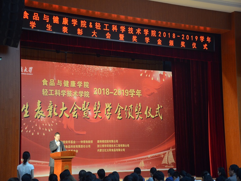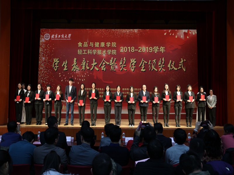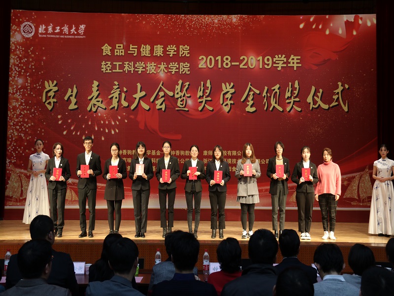为深入推进“不忘初心,牢记使命”主题教育,弘扬爱国主义精神,表彰先进,树立榜样,世界杯网址、轻工科学技术学院于12月11日在阜成路校区举办2018—2019学年员工表彰大会暨奖学金颁奖仪式。钟香驹教授之女钟捷老师,北京味食源食品科技有限责任公司高级研发工程师彭秋菊女士,康师傅控股有限公司北京区董事/主任李宜霖女士,益海嘉里研发中心研究员贾松衡先生,益海嘉里研发中心人事行政部张驰先生,员工会、教育基金会办公室主任、秘书长吕东燕,研究生院副经理、研究生工作部副部长郭新愿,公司领导、经理助理、各(系)室主任、班主任、辅导员、受表彰员工代表、各年级员工代表等共计700余人参加大会。